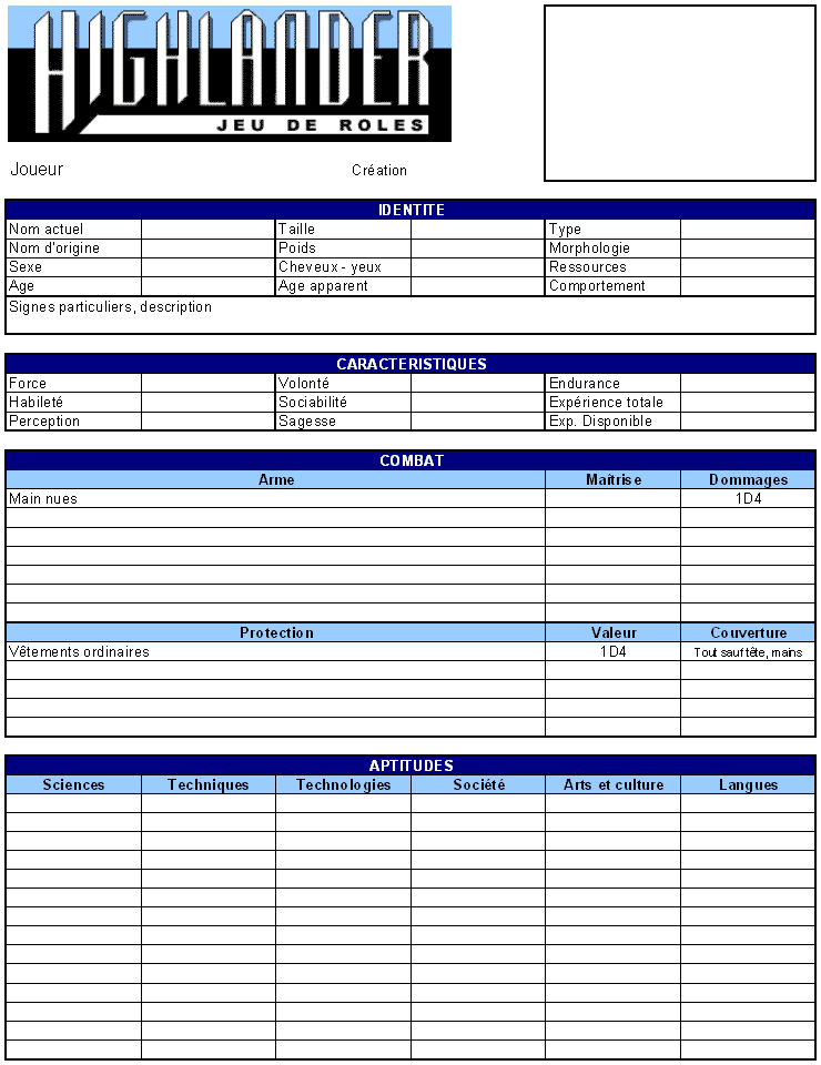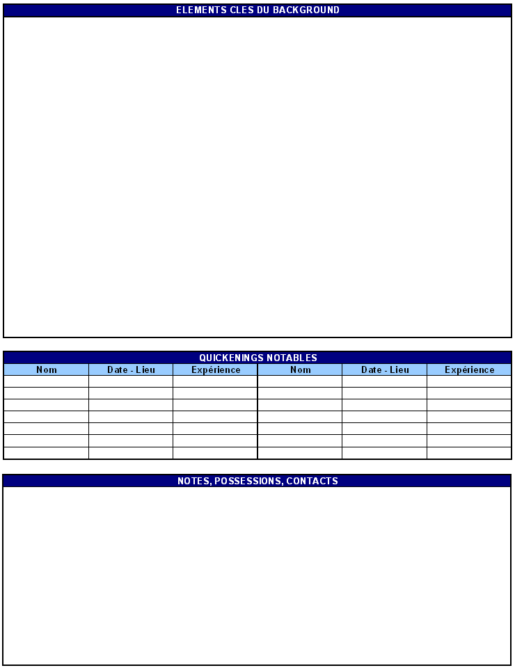 Vous avez choisi le personnage que vous souhaitez incarner, lui avez défini un "background" et êtes prêt(e) à lui donner vie ? Téléchargez une fiche vierge dans le format que vous préférez :
