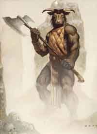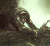 | Mathieu se relève le premier. Sa fourrure claire ondule sur ses jambes puissantes, surmontées d'un torse impressionnant portant des bras formidablement musclés et une tête qui tente bizarrement de sourire, avec une bouche démesurée aux dents pointues, des cornes luisantes. Ses petits yeux rouges, enfoncés loin dans des orbites macabres ont une expression douce qui contraste avec l'aspect général de la bête. | ![]() |