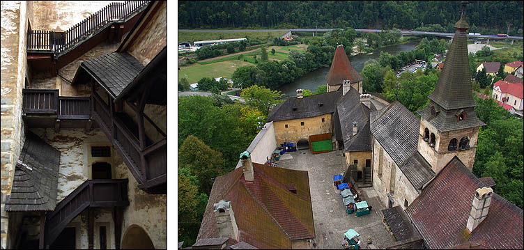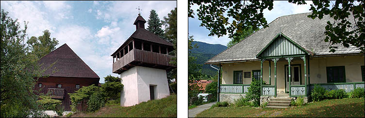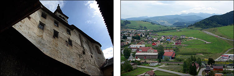 ![]() Après une nuit à Ruzomberok (rien de spécial à en dire mais j'adore le nom !) arrêt au village de Lestiny, signalé pour son ancienne église en bois décorée de belles fresques. Manque de bol, tout est fermé ! un petit papier demande d'appeler deux jours en avance (et en slovaque) la guide pour qu'elle puisse ouvrir. Bon, pas franchement pratique en vadrouille improvisée, tant pis ! On se console avec le panneau touristique d'où sont extraites les photos ci-dessous. ![]() ![]() Pique-nique à Istebnom, autre église de bois traditionnelle et charmantes maisons, le moins qu'on puisse dire c'est qu'on n'est pas dérangés par les touristes ni par les habitants, c'est désert ! Nous sommes dans une petite enclave dans le sud de la Pologne. ![]() ![]() ![]() Perché tout là haut sur un éperon rocheux, le château d'Orava (Oravský hrad, fondé en 1267) rappelera peut-être quelque chose aux plus cinéphiles... On vous aide ? Nosferatu, un des premiers (1922) et à ce jour l'un des plus terrifiants films de vampires, a été tourné ici, en décor naturel, sans qu'il eut été besoin de rien modifier. Depuis, à part le pont en bois immortalisé à temps par le film, rien n'a changé... si ce n'est des foules de touristes (c'est donc là qu'ils étaient !). ![]() ![]() La visite est forcément guidée, et on est entraînés à la suite d'un groupe compact écoutant mollement une guide qui débite (en slovaque, bien sûr) son texte d'une voix totalement monocorde. On se laisse distancer pour ![]() ![]() ![]() ![]() Ca monte, ça monte, ça n'en finit plus ! A chaque fois qu'on pense être arrivés en haut, un nouvel escalier, un nouvel encorbellement, nous entraîne toujours au-dessus, décidément, on est vraiment dans un château de film d'horreur aux proportions irréalistes. Salles de torture, animaux empaillés, petit musée des traditions... ![]() ![]() ![]() Au bout de la vallée, c'est la Pologne, dont ce château contrôlait historiquement l'accès. Ci-dessous la petite chapelle qui satisferait bien des villages en tant qu'église principale. Le piton sert d'appui comme de fondations à tout l'édifice, et des couloirs se terminent en grottes qui plongent dans la montagne, vers quels souterrains secrets ? ![]() ![]() Le château perché de Strecna, au-dessus de la rivière Vah (avec un mini-bac déguisé en château fort).