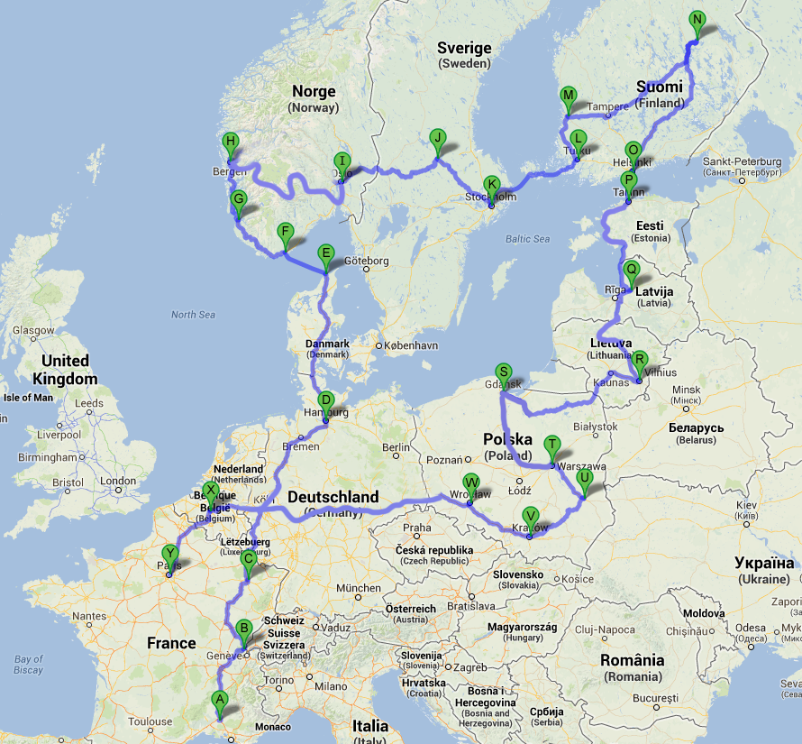 peu sur les Pays Baltes et la Pologne. Du coup ce n'est pas un tour de Scandinavie, mais en gros celui de la Mer Baltique. Vous êtes prêts, casque attaché, c'est parti...