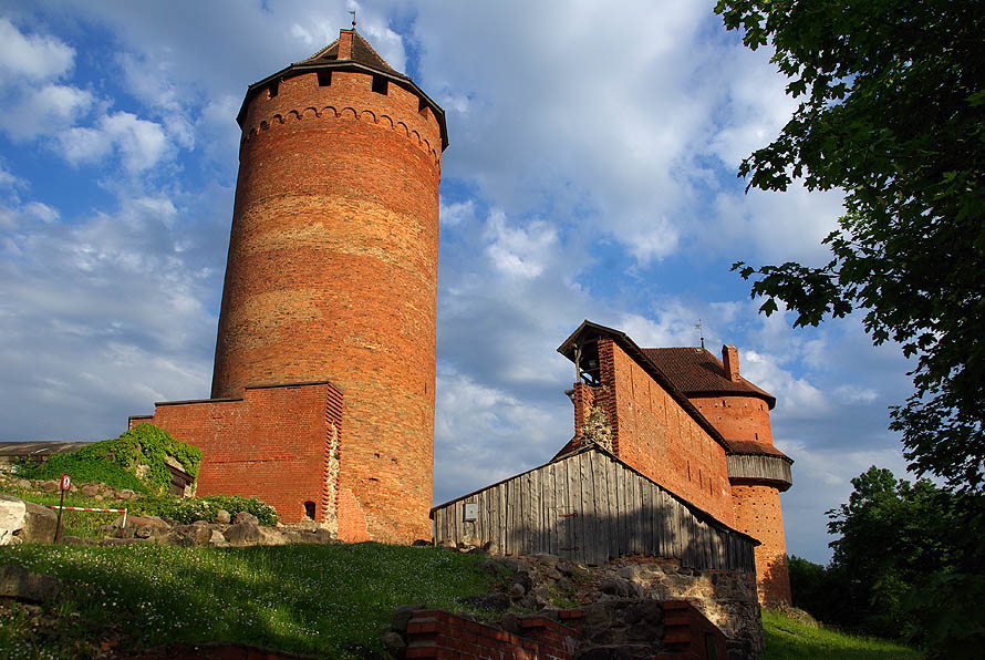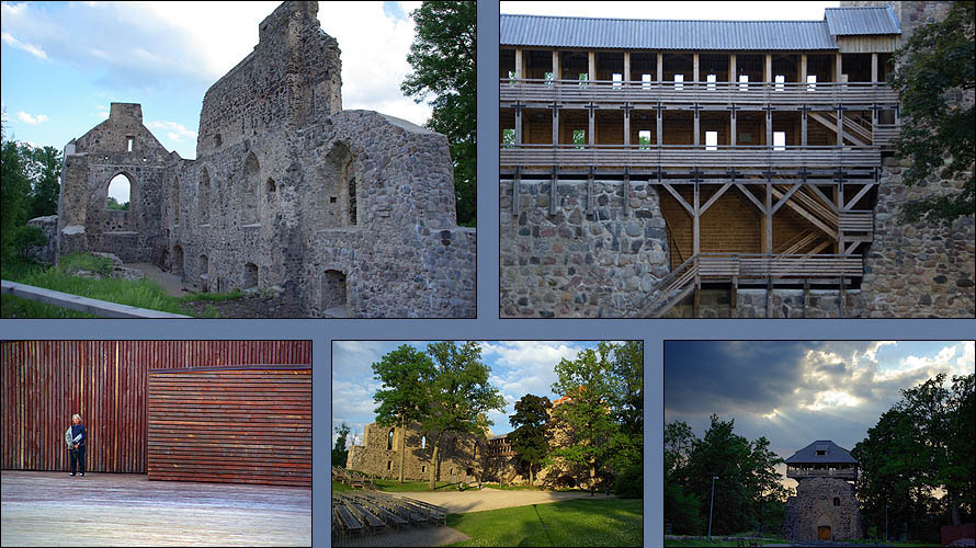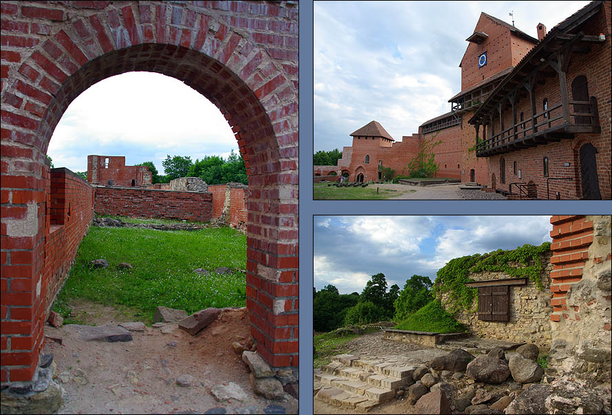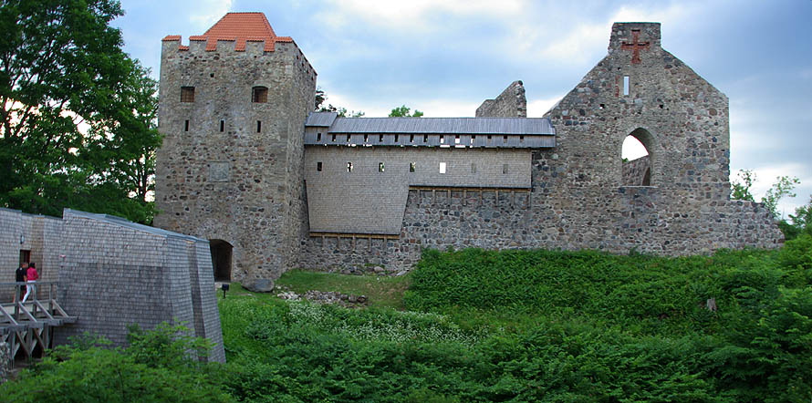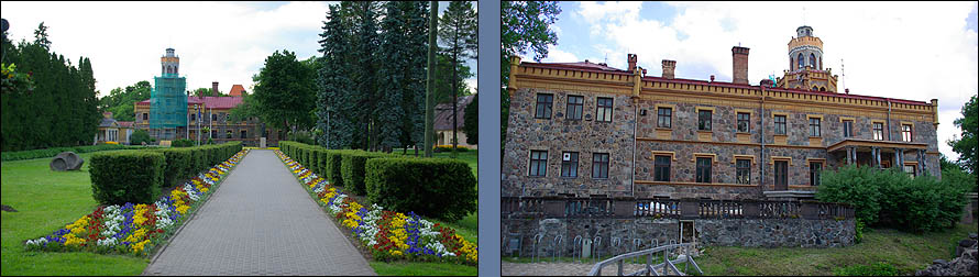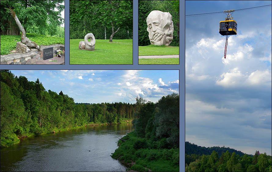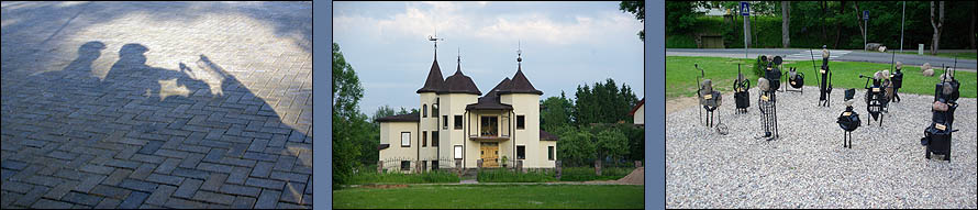 qui n'inspire vraiment pas confiance. Mais après quelques kilomètres de détour, on arrive enfin à Sigulda aux trois châteaux.![]() Le premier, dans la réserve de Turaida, était la résidence de l'archevêque, construite en 1214. Fortement bien qu'incomplètement restaurés, son donjon et un bout de murailles en brique rouge ne manquent pas d'allure. ![]() ![]() ![]() Autour du château, un vaste parc abrite église, hameau traditionnel et de très belles maisons, qui font penser à la fois à une datcha russe et, curieusement, à une demeure de planteur du sud des Etats-Unis. En tous cas, on s'y verrait assez bien... ![]() Ci-dessous à gauche, la tombe en onyx de l'infortunée Maija Roze, sorte de Juliette locale, belle jeune fille tuée par le soupirant qu'elle repoussait. A côté, le jardin des chansons dainas, illustrant les chansons poétiques folkoriques, importantes dans la culture lettone. A droite, saut à l'élastique depuis un télécabine. On a attendu un moment que le gars se lance pour prendre une photo en action, mais il n'arrivait pas à se décider et les autres châteaux nous attendaient sous les derniers rayons du soleil. ![]() ![]() Le nouveau château de Sigulda, construit au XIXème siècle par le prince russe Dimitri Kropotkine qui voulait faire de Sigulda un paradis touristique. Moui, pas super convaincus... ![]() Juste derrière, le vieux château de Sigulda du XIIIème siècle accueille dans ses ruines une scène de spectacle. ![]() ![]() Qu'elle est belle ma moto... ![]() | ||||||||||||||||||