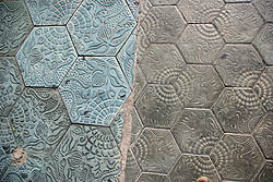 Même les pavés sont décorés de motifs floraux ou géométriques. A droite, sculpture contemporaine à un carrefour.