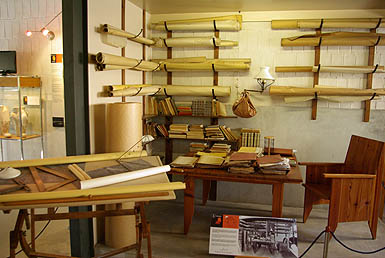 Ci-dessus, reconstitution du bureau de l'architecte. Concevoir cette structure aussi innovante et aérienne, sans ordinateurs, a demandé une imagination et une technique étonnantes.