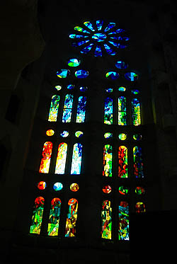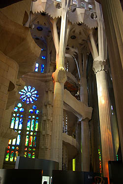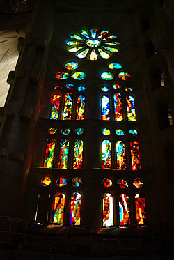 Dans la nef, on a l'impression de se trouver au coeur d'une entité mi-minérale mi-organique, illuminée par une superbe lumière, blanche tombant des voûtes, et chatoyantes de couleurs par les vitraux latéraux.