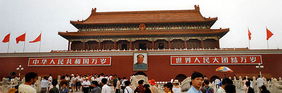 place Tien An Men, bordée par la Cité Interdite. Sur le mur extérieur demeure l'unique portrait de Mao.