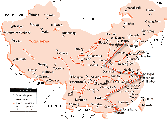 Le tout s'est fait en un mois (de mi-juillet à mi-août), bien court pour un pays aussi immense mais, les conditions de voyage étant relativement difficiles, c'était déjà pas mal... Comme toujours, nous avons utilisé les moyens locaux "populaires" pour l'hébergement, le transport et la restauration, mais nous tenons bien à préciser que ce voyage date de 1993 ! La Chine est en pleine mutation, et si à l'époque elle venait tout juste de s'ouvrir aux touristes (nous avions encore une liste de plus de 700 villes interdites aux étrangers), c'est aujourd'hui une puissance en pleine expansion. Tout bouge très vite, particulièrement les villes, et la Chine d'aujourd'hui n'est déjà plus la même qu'il y a dix ans...