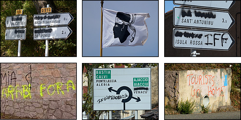 Conclusion ![]() Ce furent dix jours vraiment super, un régal de motard, de belles découvertes, et avec ce qui semble un compromis parfait entre la météo globalement parfaite (à deux orages près) et une fréquentation très raisonnable. Il n'y a qu'à certains hauts lieux touristiques comme Bonifacio ou au Cap Corse que l'accès aux villes et aux parkings a été un peu compliqué, encore qu'avec la moto on s'en sort toujours. Mais en haute saison et en boîtaroues, il paraît qu'on attend parfois des heures sans avancer. En tous cas, il faut vraiment se méfier non seulement des autres conducteurs, locaux rapides comme visiteurs au ralenti, les uns comme les autres semblant incapables de tenir une trajectoire. Sans oublier les bestioles de tout poil planquées dans les bas-côtés. Pas le moment de claquer un chrono ! ![]() ![]() Un mot sur l'accueil, la réputation des Corses étant parfois un peu... controversée. Nous n'avons jamais rencontré autre chose que cordialité, sympathie et sourires. Certes la haute saison était terminée, nous ne faisions que passer et la moto est toujours un bon moyen de rapprocher les gens. Mais il est indéniable que des signes sont souvent visibles du rejet des français du continent (IFF, AFF : I Franci Fora, A Francia Fora, les Français/la France dehors), des touristes en général et des Arabes en particulier. Dans ce contexte, le drapeau à la tête de Maure décapité prend une symbolique particulière. Sur pratiquement TOUS les panneaux, le nom en Français (ou orthographié à l'italienne) est tagué pour ne garder que le nom corse. En tous cas, en tant que simples visiteurs, ça n'a pas entaché ce séjour très chouette, qui nous était recommandé depuis longtemps et que nous recommandons chaudement à notre tour. ![]() ![]()