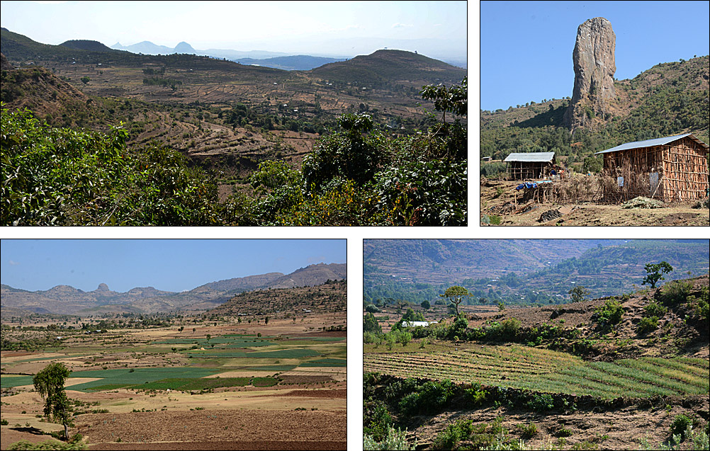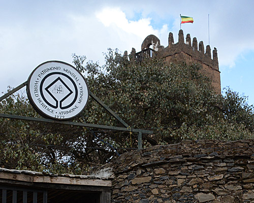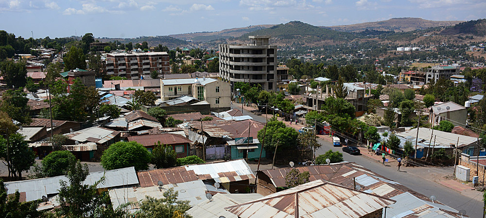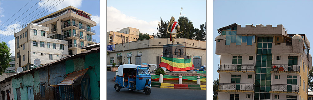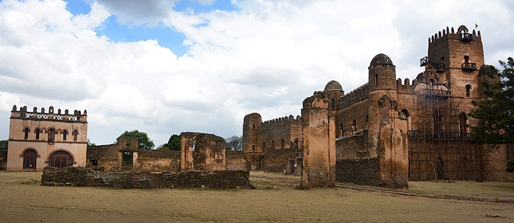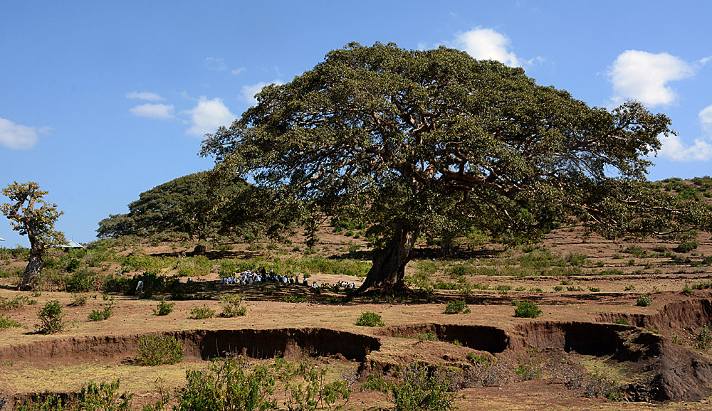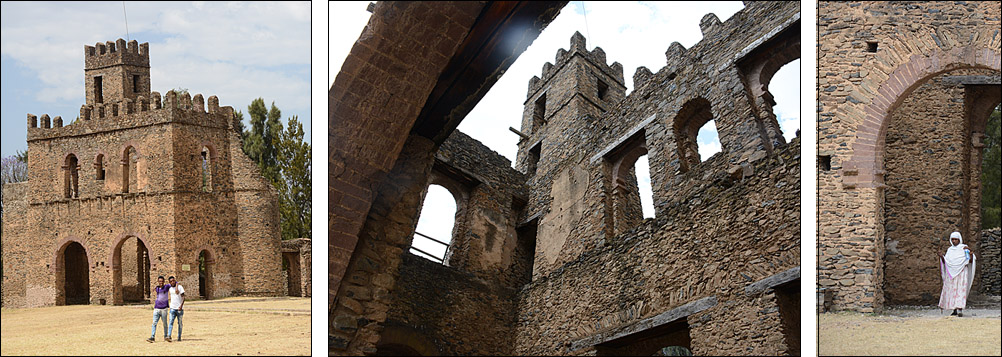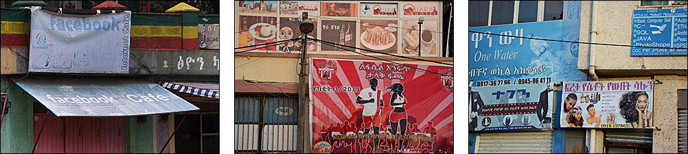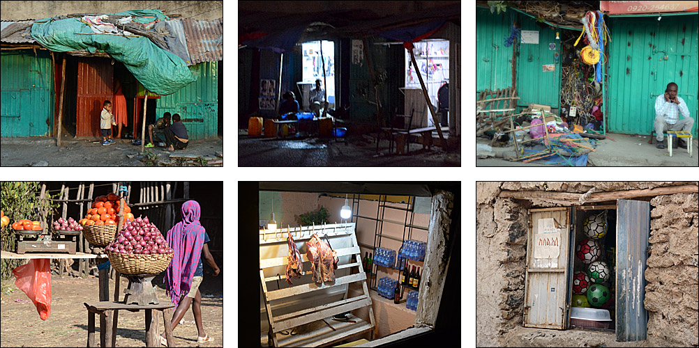 ![]() Nous partons pour quelques heures de route vers le nord, à travers des paysages toujours aussi valonnés et bien plus verdoyants que l'image d'Epinal aride qu'on peut avoir de ces pays (et qui n'est pas volée, mais dans d'autres régions), avec toujours beaucoup de monde dans les champs après les moissons, notamment pour glaner. ![]() La plupart des arbres sont des freluquets qui ont à peine le temps de pousser qu'ils finissent en supports pour les murs de maisons ou en bois de chauffage et de cuisine, mais parfois, des géants ont traversé les âges, et abritent sous leur ombre majestueuse tout un village à l'heure des palabres. ![]() Le long des routes, on trouve aussi nombre de diacres et prêtres faisant constamment la quête pour entretenir ou agrandir les églises. On a l'impression qu'ils plantent des graines d'oratoires, qui germent en chapelles et deviennent avec le temps de vrais temples en tôle ondulée peinte aux couleurs du drapeau. ![]() ![]() La ville moderne de Gondar, à l'image des autres, est plutôt laide. On note toutefois un certain effort architectural, des immeubles tentant de rappeler les châteaux qui font sa réputation, avec un succès mitigé. ![]() L'activité commerçante est intense, avec des boutiques assez peu variées mais nombreuses. Notez ci-dessous à droite le stock de fils électriques complètement emmêlés en vrac dans la cahute, la boucherie bien sûr non réfrigérée, ou encore les cyber-cafés un peu délavés. ![]() ![]()