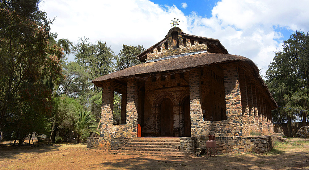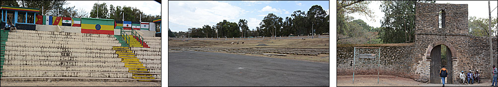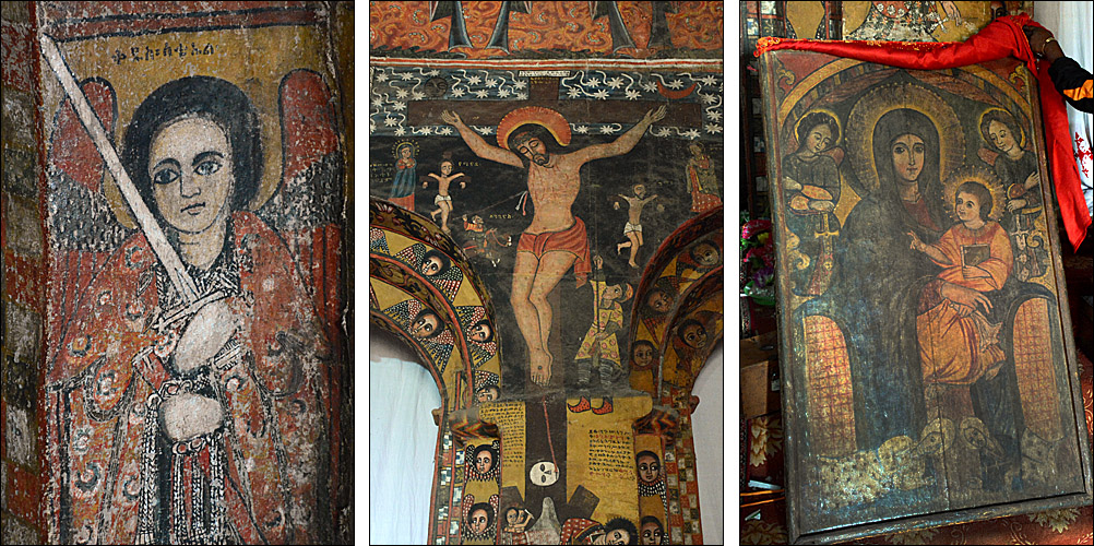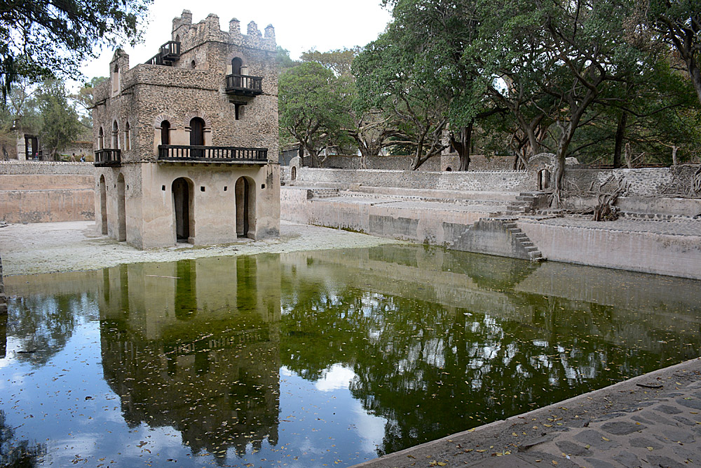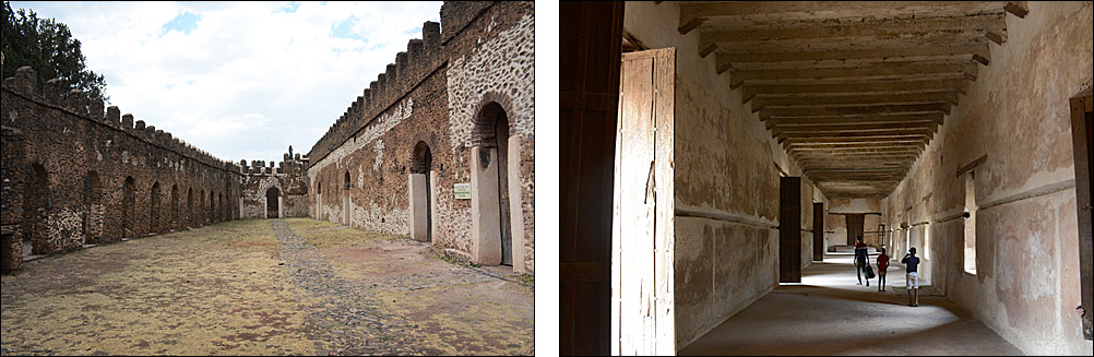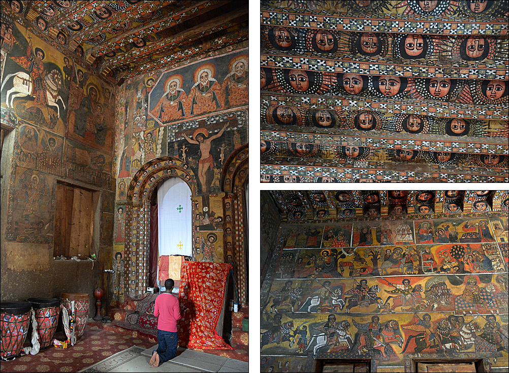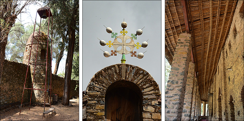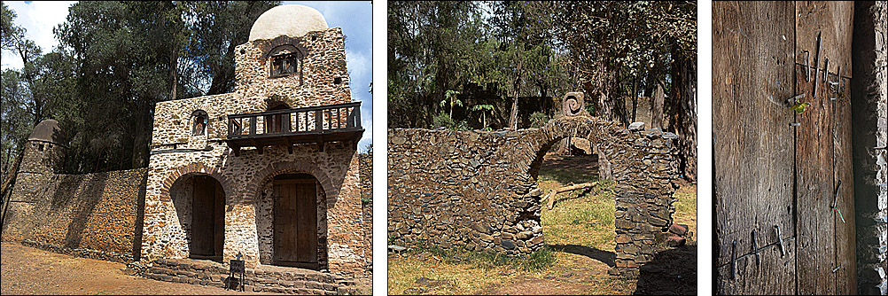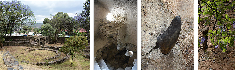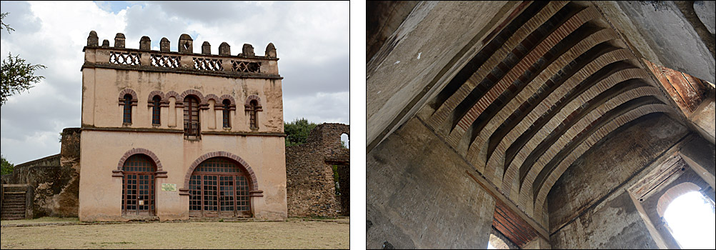 ![]() ![]() ![]() Parmi les motifs récurrents et qui peuvent surprendre dans un contexte chrétien orthodoxe, on trouve des étoiles de David, comme ci-dessous à gauche, car Fasiladas appartenait à la dynastie Salomonide, issue du roi Salomon. Et comme disait Victor Pivert : "Salomon vous êtes juif ??". A droite, un grand réservoir d'eau pour les longs mois d'été. ![]() ![]() Ci-dessus, la coquille vide de la chancellerie et ci-dessous, la bibliothèque de Yohannes Ier, qui renfermait de nombreux rouleaux et parchemins et a été défigurée par les Italiens. A droite, le plafond du palais d'Iyasou Ier, autrefois couvert d'or, de peintures, de miroirs vénitiens et d'ivoire. ![]() ![]() Les grandes cages ci-dessus abritaient les lions noirs d'Abyssinie d'Halié Selassié jusqu'en 1990, poursuivant une tradition de ménagerie initiée par David III au XVIIIème. Ci-dessous, les termes construits par Iyasou Ier sur le conseil d'un médecin français pour soigner les problèmes de peau, et même la syphilis, rien que ça. Là aussi les Italiens ont tout saccagé, transformant le bâtiment ancien pour en faire une cuisine. L'avant-dernière photo est une patère traditionnelle faite d'une corne plantée dans la pierre. Et toujours les superbes jakarandas en fleurs... ![]() ![]() Ci-dessus les écuries et la salle de banquet de Bakaffa (1720), ci-dessous le palais de son épouse Mentewab qui lui a succédé de façon très éclairée, elle a notamment mis en place des écoles pour les femmes. ![]() Un peu plus loin dans la ville, cachée dans ses petits remparts personnels où les tourelles représentent les apôtres, la magnifique église Debre Birhan Selassie (fin XVIIIème) dresse ses vieilles pierres entre des arbres vénérables pleins d'oiseaux colorés (et de vautours, certes). ![]() ![]() A gauche, le "clocher", comme toujours séparé du bâtiment principal et réduit à sa plus simple expression. Au centre, les (véritables) oeufs d'autruche représentant la bonté du Christ envers les hommes. ![]() Si l'extérieur est très joli, c'est surtout l'intérieur qui rend ce lieu célèbre. Les peintures ne sont pas les plus anciennes mais elles recouvrent l'ensemble des murs et du plafond, avec notamment 135 chérubins représentant l'omniprésence de Dieu. Une des parois montre les héros masculins de la bible, l'autre est dédiée à l'histoire de la Vierge et de saintes. Les fidèles étaient assis de façon à faire face au mur concernant leur propre sexe. En tous cas tout le monde est couleur locale, plus réaliste que les peintures kitsch modernes avec un Jésus tout blond et rose. ![]() ![]() ![]() Deux kilomètres après, on traverse le stade aux gradins minimalistes (ci-dessus) pour visiter les bains de Fasiladas. A l'origine un genre de palais d'été, avec la particularité d'être construit au centre d'un bassin rempli d'eau, qui servait aux fêtes religieuses mais aussi, fait a priori unique pour son époque (fin XVIIème), de vaste piscine de loisir pour ce roi amateur de natation (et qui ne pouvait profiter de la rivière à la faune trop dangereuse). Les cérémonies de Timkat, mi-janvier, célèbrant le baptême du Christ perdurent de nos jours ; la foule se baigne alors dans le bassin remis en eau pour l'occasion (il n'en restait qu'un fond à notre passage). ![]() ![]() ![]() |