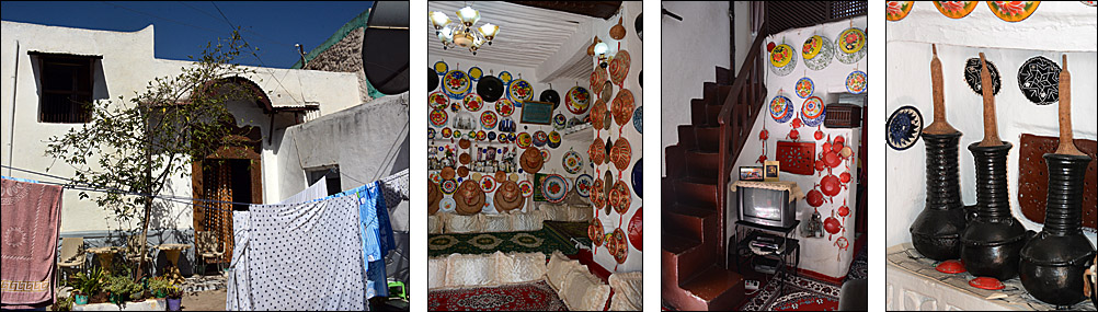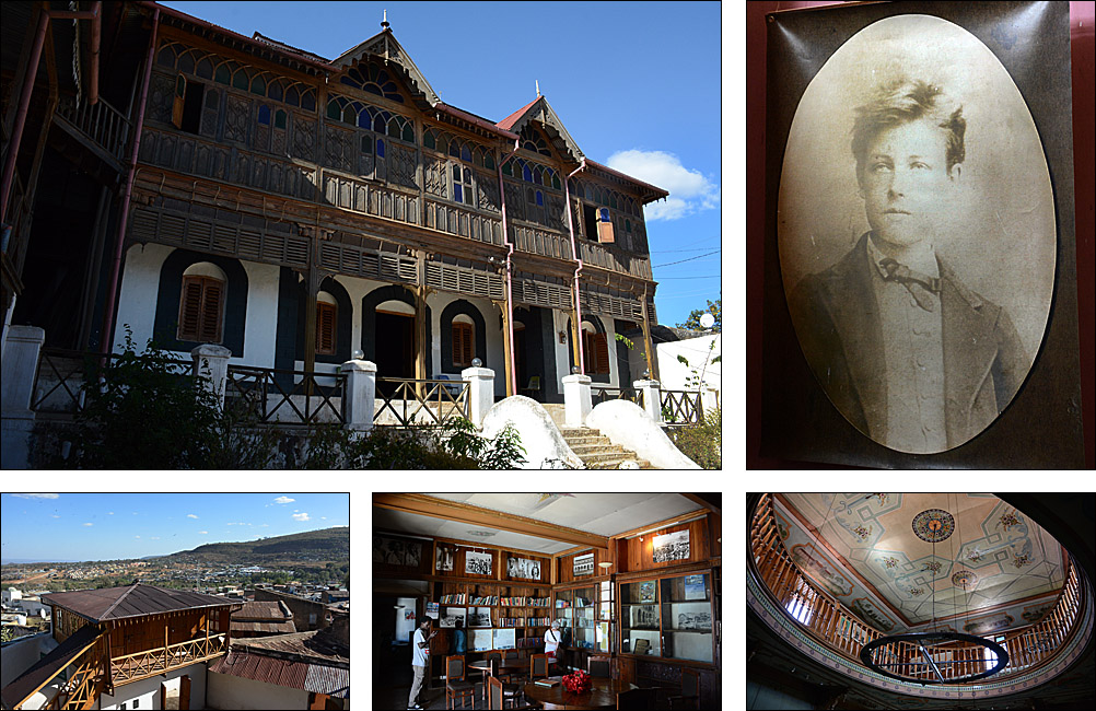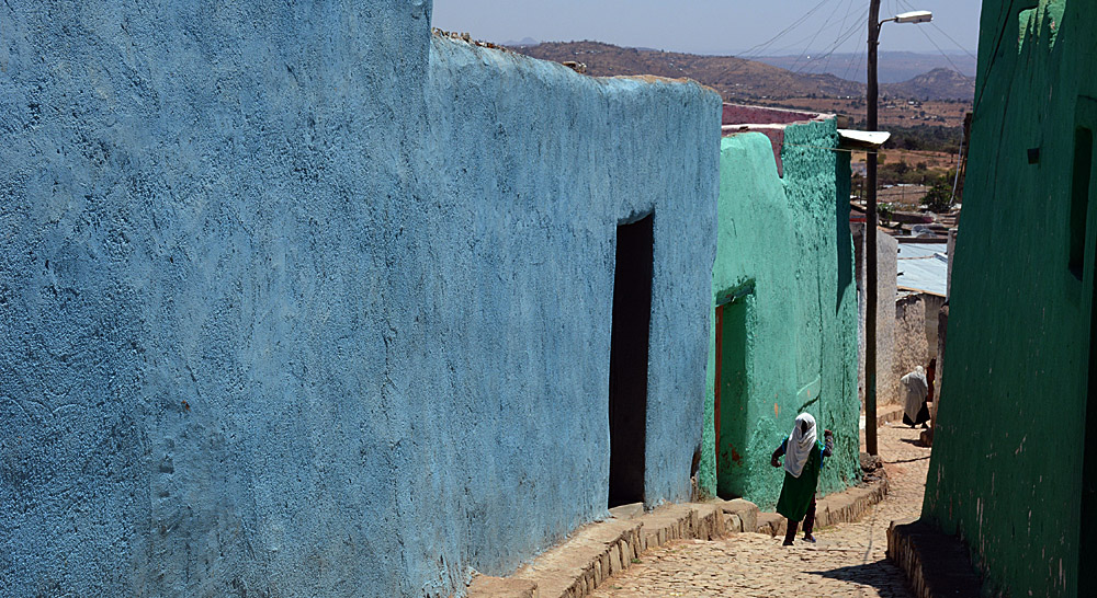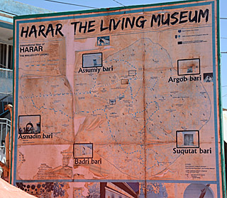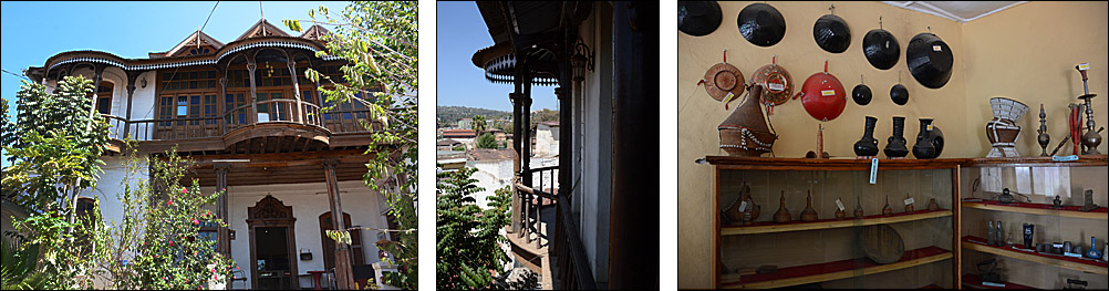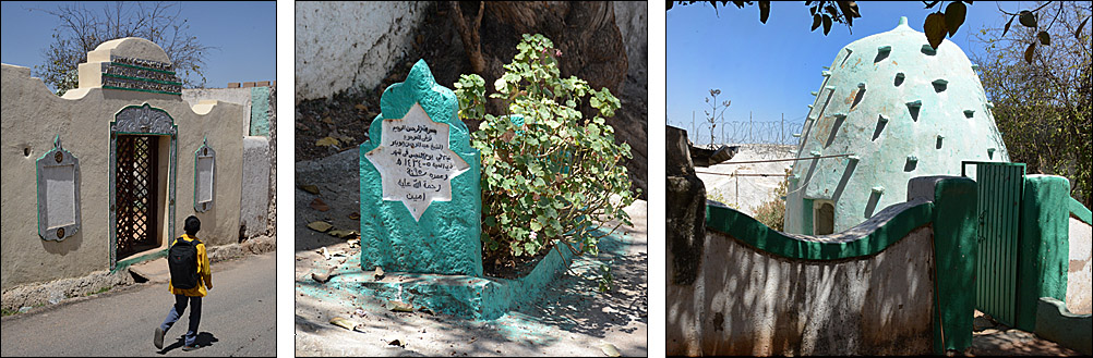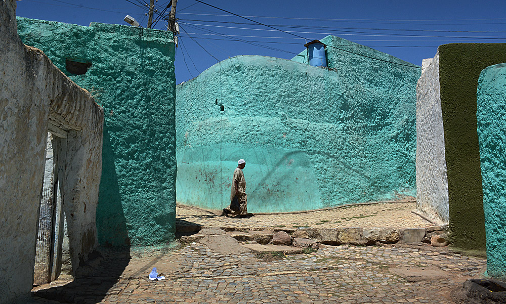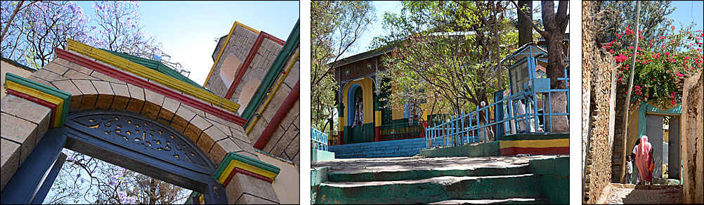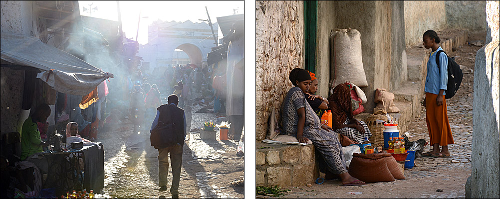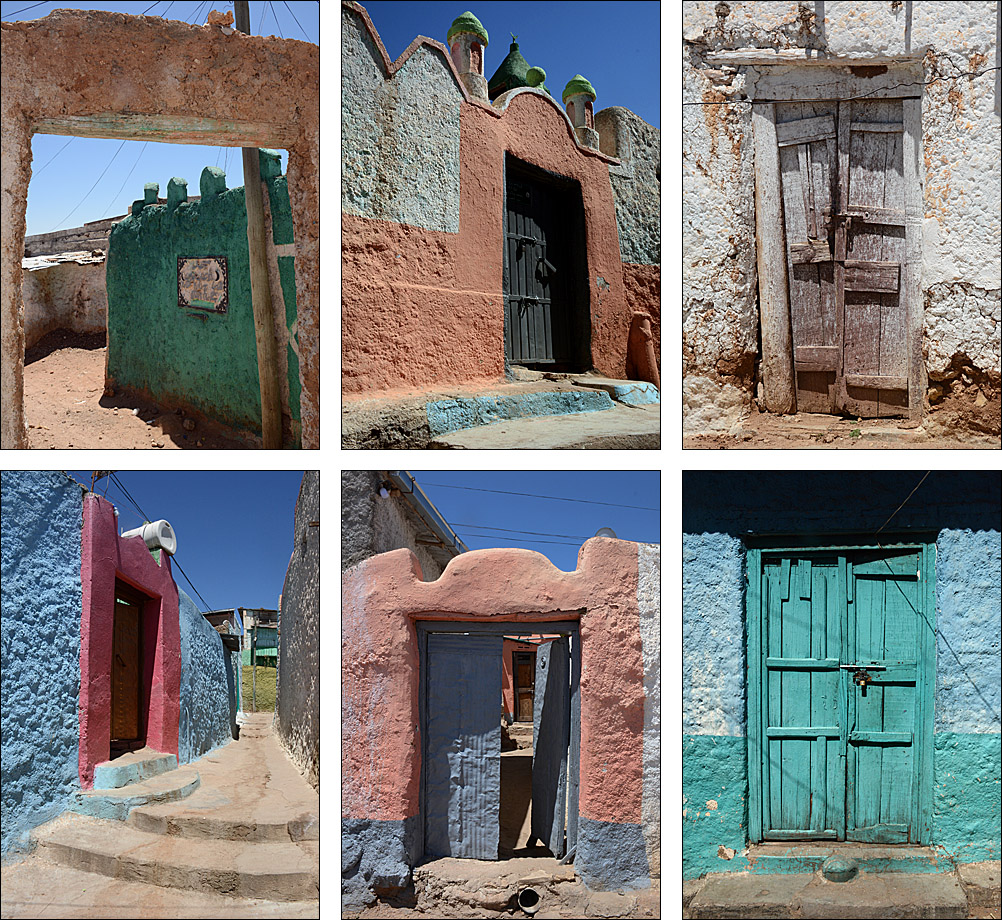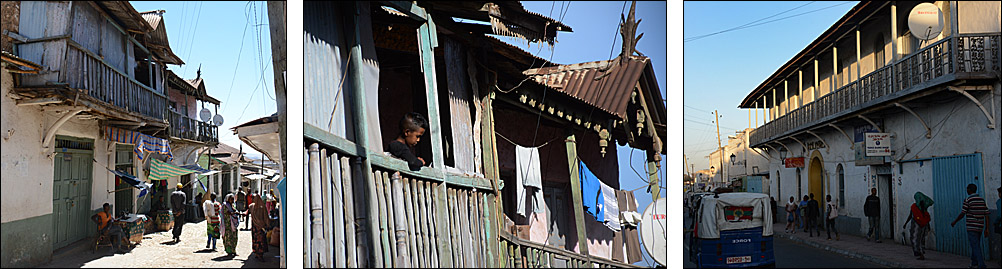 ![]() ![]() Les couleurs étonnantes se juxtaposent sur les façades et les tenues des femmes. Le centre-ville comptait 99 mosquées, une pour chaque nom d'Allah, mais une vingtaine s'est effondrée faute d'entretien. Il y a aussi plus d'une centaine de tombeaux et sanctuaires. Très peu d'églises orthodoxes en revanche (l'unique du centre-ville ci-dessous), mais les Hararis insistent sur le fait que les communautés vivent en bonne entente. Ci-dessus, le passage particulièrement étroit est nommé la "rue de la paix", car on ne peut s'y croiser qu'avec courtoisie, faute de place. ![]() C'est un vrai bonheur de se balader dans ces 368 ruelles tranquilles, pratiquement sans aucun touriste. Ni boutiques ni fenêtres, tout se passe à l'intérieur des cours furtivement entrevues lorsque quelqu'un entre ou sort. ![]() ![]() Nous sommes curieux de voir les intérieurs qui se cachent derrière ces portes, mais nous n'osons bien sûr pas frapper. Le guide qui tient à nous accompagner lors de l'une des balades en ville nous en donne cependant l'opportunité, en nous emmenant chez une ses connaissances. Ce n'est pas une boutique, juste une déco très portée sur les paniers tressés ! Ces maisons en argile à poutres de bois s'appellent des "gegar". Il reste 2000 de ces habitations Adare typiques où l'on trouve traditionnellement 11 niches pour stocker la vaisselle, le Coran et aujourd'hui les appareils modernes. Une étagère est dédiée aux pots "aflala" (à droite), en argile noire, pour ranger l'argent, l'or, les médicaments et des graines. Un support pour les lances est aussi prévu. ![]() L'étroitesse des rues n'empêche pas un trafic intense, et si les voitures ne passent pas, ça ne dissuade pas les "Bajaj" de se frayer un chemin au millimètre près. ![]() ![]() L'une des ces rues pavées en pente se nomme "Machina gilgit", d'après le bruit incessant des vieilles machines à coudre à pédale des dizaines de tailleurs installés sur l'absence de trottoirs, qui assemblent, reprisent et confectionnent pour un prix modique tout qu'on peut imaginer. ![]() Une des caractéristiques d'Harar, ce sont aussi ces grands balcons à l'équilibre parfois précaire. ![]() Parmi les plus belles maisons, celle du ras Tafari (qui y a passé sa lune de miel) a été bâtie par un marchand indien (il y a un Ganesh incongru au-dessus de la porte !). Elle abrite le musée Sherif Harar, avec une collection peu mise en valeur d'armes, pièces, sculptures, et peintures d'une naïveté parfois déconcertante. ![]() Une autre très belle maison était celle dont Rimbaud envoyait des photos à sa mère pour lui montrer comme il était bien logé en Ethiopie. En pratique, il vivait plus modestement, mais la demeure accueille aujourd'hui le musée consacré au poète maudit, avec des photos émouvantes de lui pendant ses trafics pas toujours rentables d'armes, d'opium et de café. Il accompagnait lui-même à pied ses caravanes, fut le premier Blanc à entrer dans l'Ogaden (au sud-est) et connut moults déboires, avant de revenir mourir à Marseille à 37 ans. ![]() Ci-dessous la grande mosquée Jami, au-millieu la cathédrale Medhane Alem sur la place Feres Magala, avec un monument aux martyrs des opposants à Menelik. ![]() Parmi les nombreux lieux saints, on trouve aussi des tombeaux comme ci-dessous celui de l'émir Nur, qui fit construire les murailles de la ville. ![]() Les remparts datent du XVIème siècle, sur 5 mètres de haut ils font le tour de la ville historique sur 3,5 kilomètres et devaient la protéger de l'avancée vers le nord des Oromos. Ce n'est qu'au XXème siècle que la ville a osé se développer au-delà des murs. Ils sont percés de 5 portes d'origine, plus une sixième en 1889. ![]()