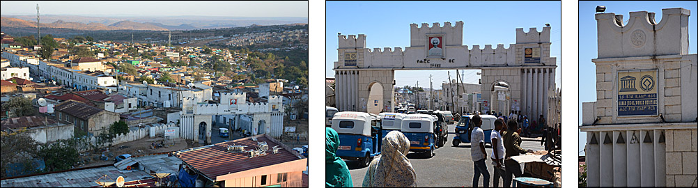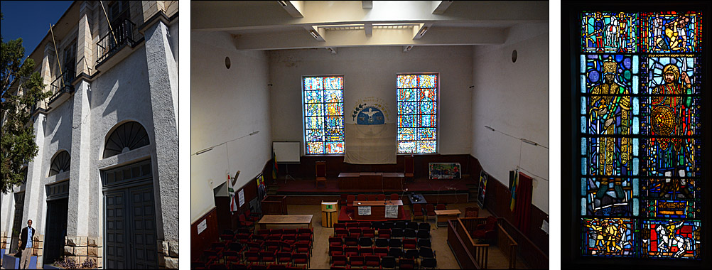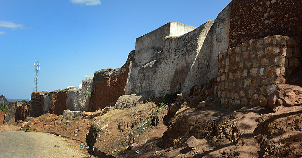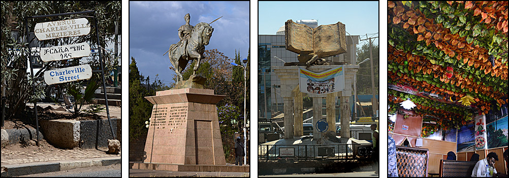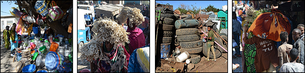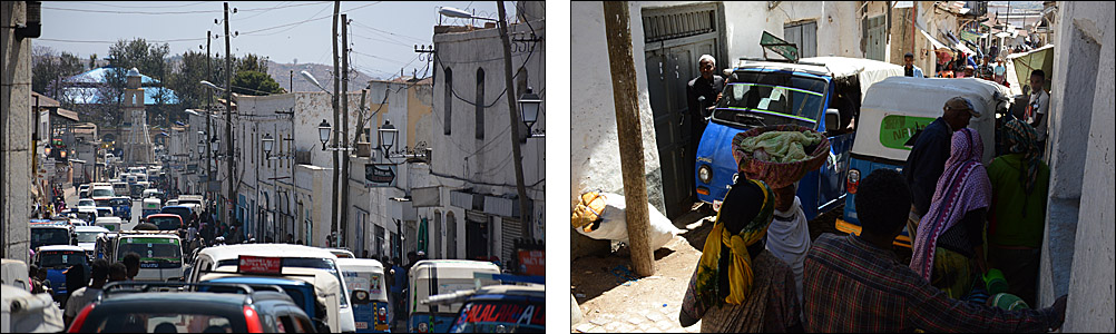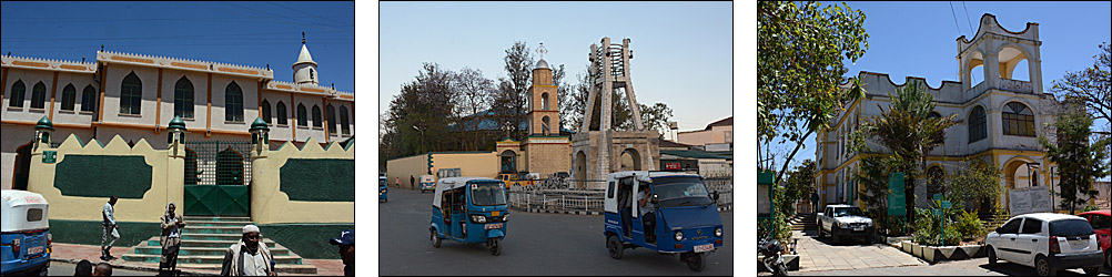 la capitale et la côte de Djibouti. Il paraît qu'aujourd'hui encore les cheminots parlent entre eux en français et jouent à la pétanque !![]() A part ça, Dire Dawa est surtout une plaque tournante commerciale, avec un vaste marché totalement basique et déglingué, les marchandises à même le sol, du recyclage en boucle de trucs usés jusqu'à la corde... ![]() L'ambiance est assez lourde, un guide nous accompagne de près et n'est pas de trop, les marchands ne semblant guère apprécier notre présence ni les photos. ![]() C'est riche de couleurs, de sons et d'odeurs, mais nous n'y passons qu'une heure avant de reprendre une voiture pour le sud et la bien plus accueillante Harar. ![]() ![]() Une grosse heure de route à travers une campagne assez aride nous amène en vue de la mythique Harar, avec près de 200.000 habitants, et tout de même perchée à 1850 mètres d'altitude. Ce qu'on en voit en premier, ce sont des banlieues inachevées, puis un centre-ville moderne avec des immeubles colorés à défaut d'être esthétiques, des centres commerciaux, d'imposantes statues, et la large avenue "Charleville-Mézières" sur laquelle donne notre excellent Ras hôtel. ![]() ![]() ![]() Les monuments modernes n'ont guère de charme à part le tribunal avec ses beaux vitraux, où un fonctionnaire nous vante la (récente) indépendance et efficacité de la justice. ![]() ![]()