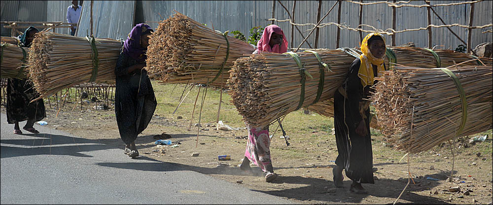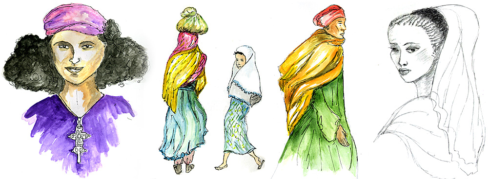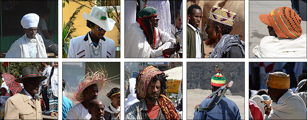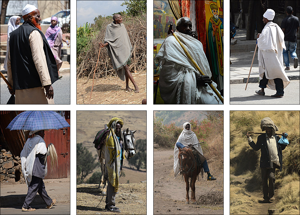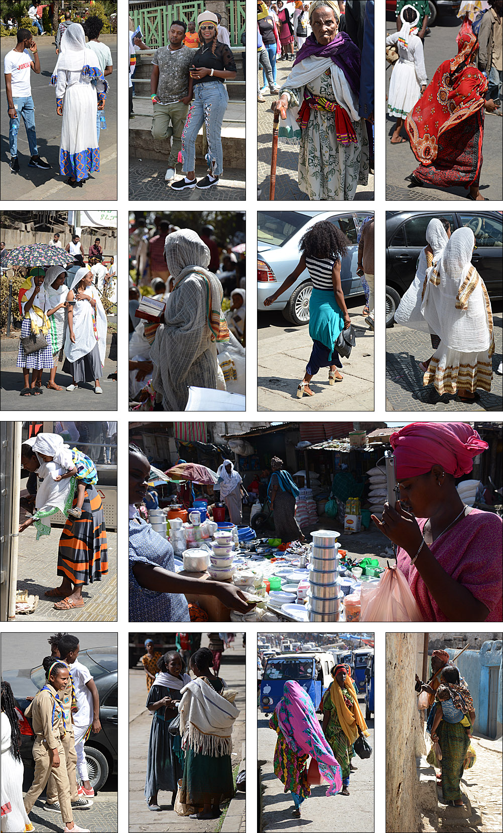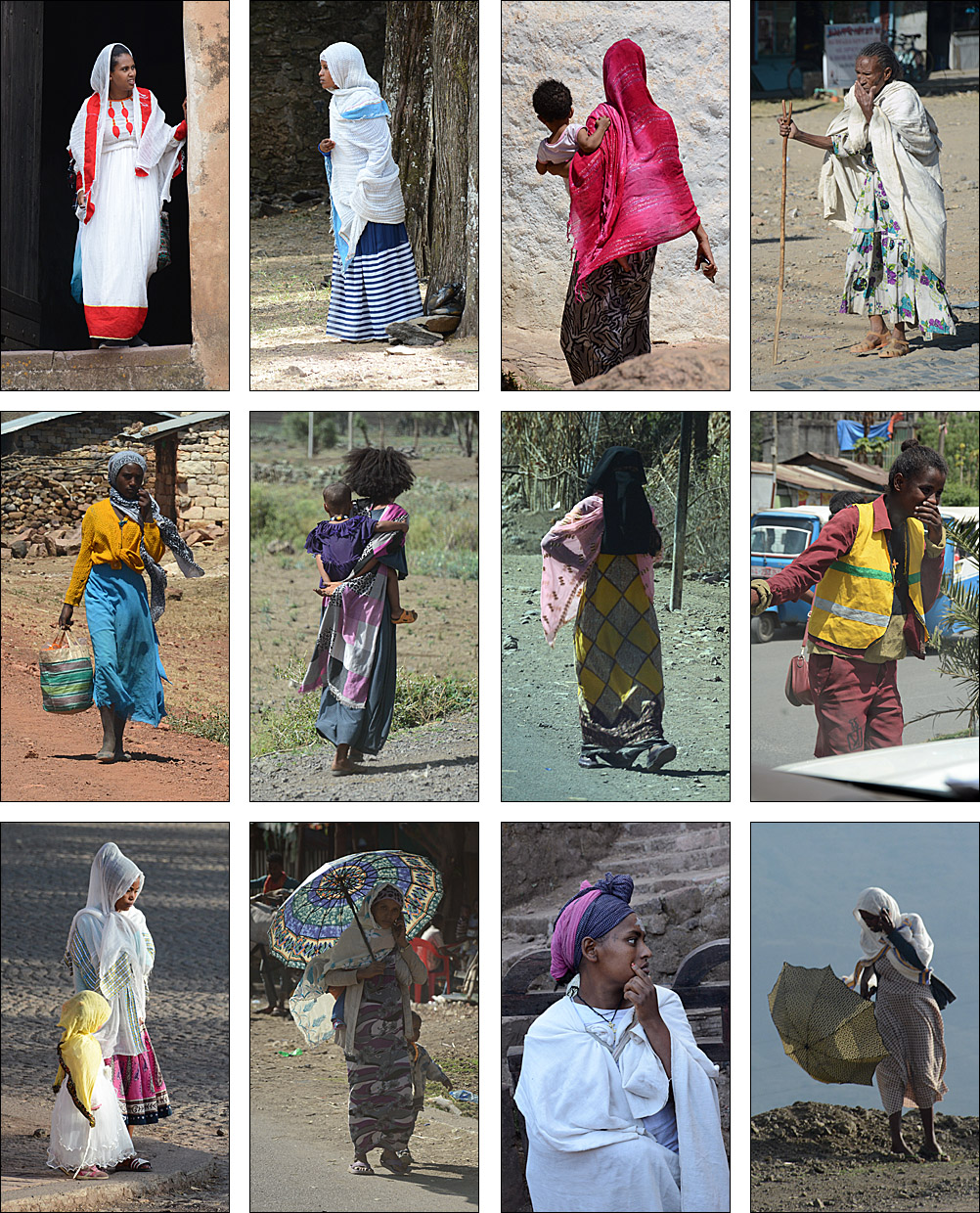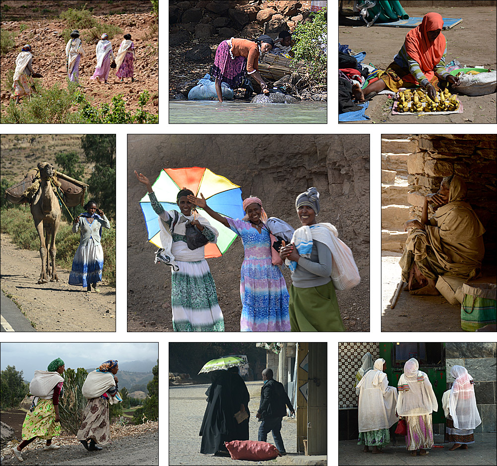 | Si d'habitude nous ne prenons guère de photos des gens, en l'occurence ce ne sont pas les portraits qui manquent. Pardonnez-nous cette page un peu longue, mais le tri a été fort difficile et ce n'est là qu'un petit échantillon des rencontres ou des visages aperçus, souvent dans un labeur manuel ingrat, mais aussi avec le sourire malgré tout.              A chaque peuple ses tenues traditionnelles, plus marquées chez les femmes : pantalon et robe par dessus pour les Harari, enveloppées de voiles pour les Amahri, une sorte de pagne long traînant au sol pour les Oromos, assez rarement des tchador ou burqa... et mode anonymement occidentale pour les jeunes branchées de toutes origines !  Les femmes ont des chevelures magnifiques, extraordinairement volumineuses ou tressées de mille façon raffinées... mais le plus souvent cachées sous leur foulard. A noter que les femmes jouissent en Ethiopie d'un certain respect, elles ont le droit de propriété et de vote, le divorce est aisé et elles ont une représentante au gouvernement.        Le châle traditionnel dans lequel les hommes des montagnes s'enroulent est le shamma, protégeant tant de la poussière que du vent ou du soleil.