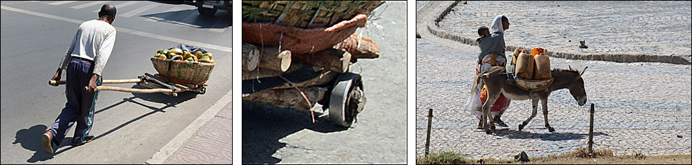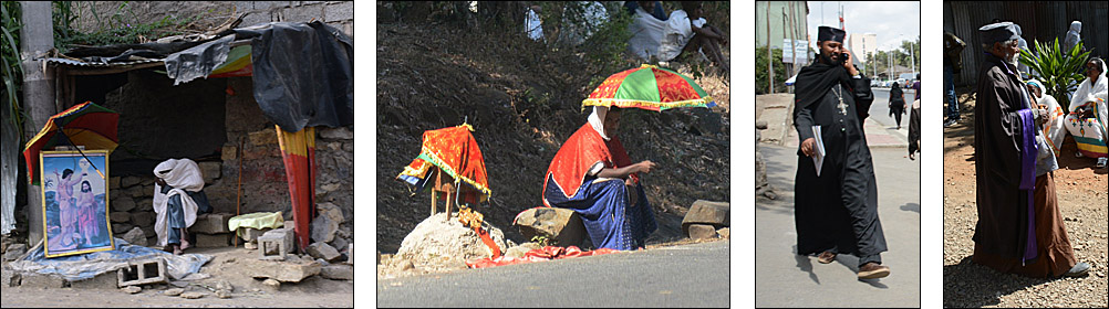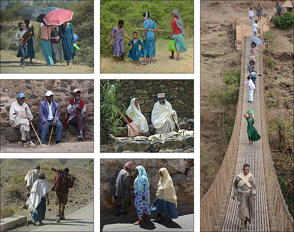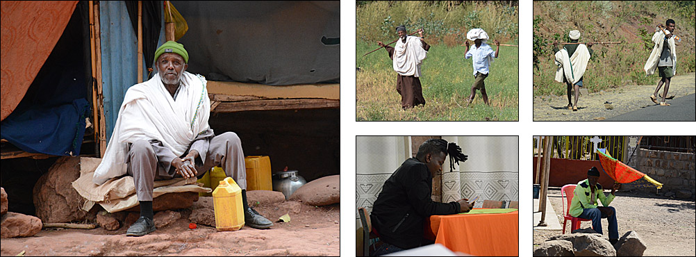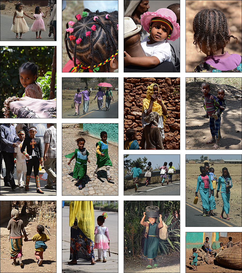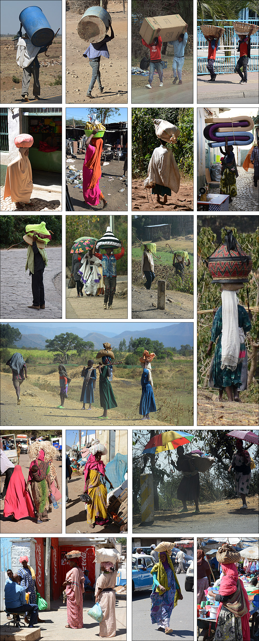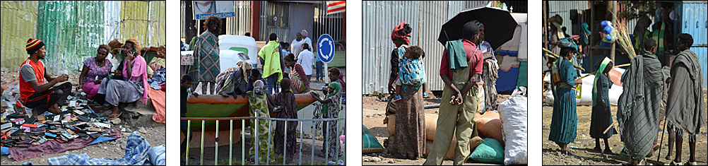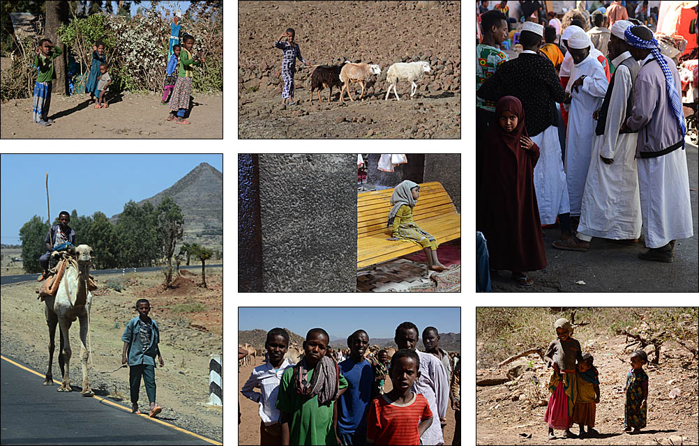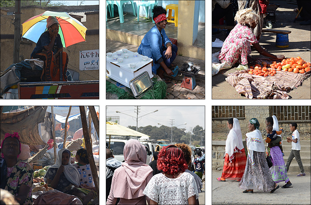 | Si d'habitude nous ne prenons guère de photos des gens, en l'occurence ce ne sont pas les portraits qui manquent. Pardonnez-nous cette page un peu longue, mais le tri a été fort difficile et ce n'est là qu'un petit échantillon des rencontres ou des visages aperçus, souvent dans un labeur manuel ingrat, mais aussi avec le sourire malgré tout.              A chaque peuple ses tenues traditionnelles, plus marquées chez les femmes : pantalon et robe par dessus pour les Harari, enveloppées de voiles pour les Amahri, une sorte de pagne long traînant au sol pour les Oromos, assez rarement des tchador ou burqa... et mode anonymement occidentale pour les jeunes branchées de toutes origines !  Les femmes ont des chevelures magnifiques, extraordinairement volumineuses ou tressées de mille façon raffinées... mais le plus souvent cachées sous leur foulard. A noter que les femmes jouissent en Ethiopie d'un certain respect, elles ont le droit de propriété et de vote, le divorce est aisé et elles ont une représentante au gouvernement.        Le châle traditionnel dans lequel les hommes des montagnes s'enroulent est le shamma, protégeant tant de la poussière que du vent ou du soleil.