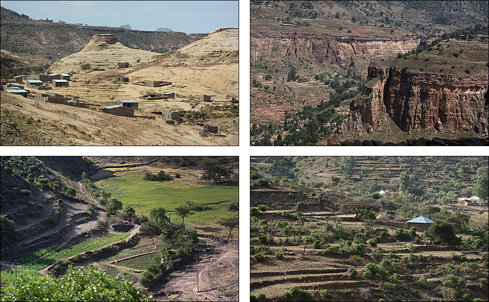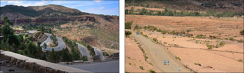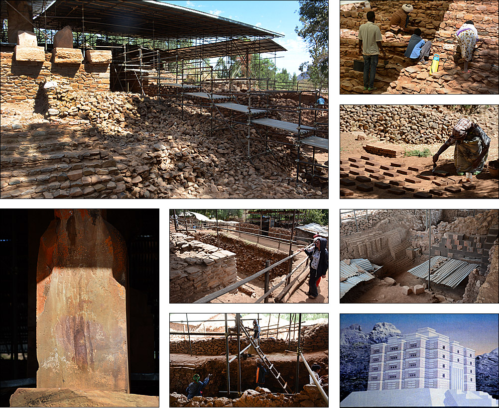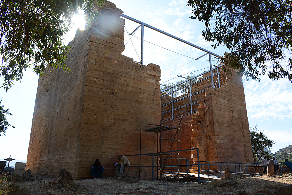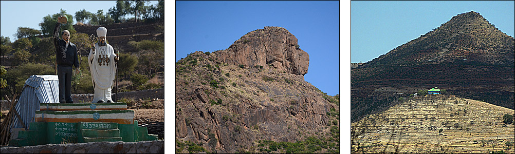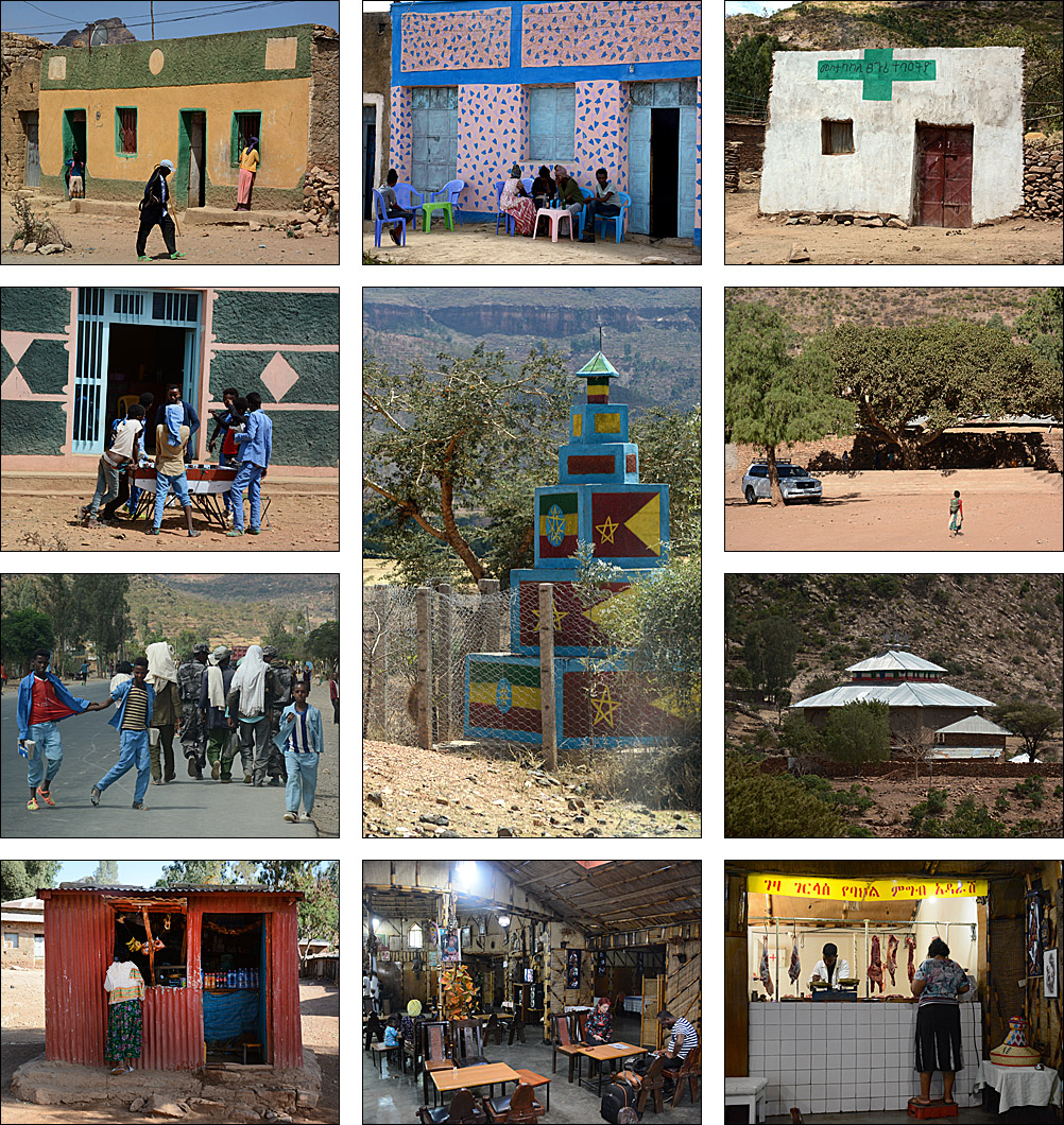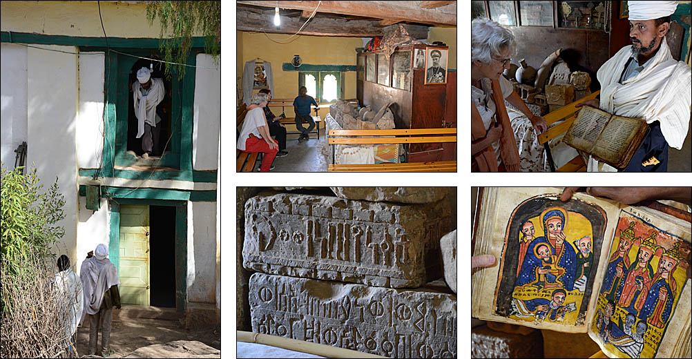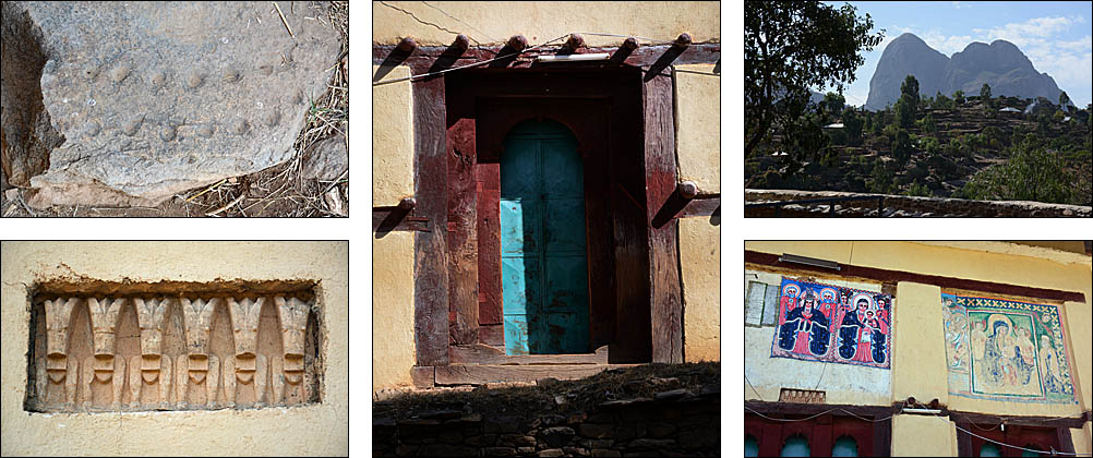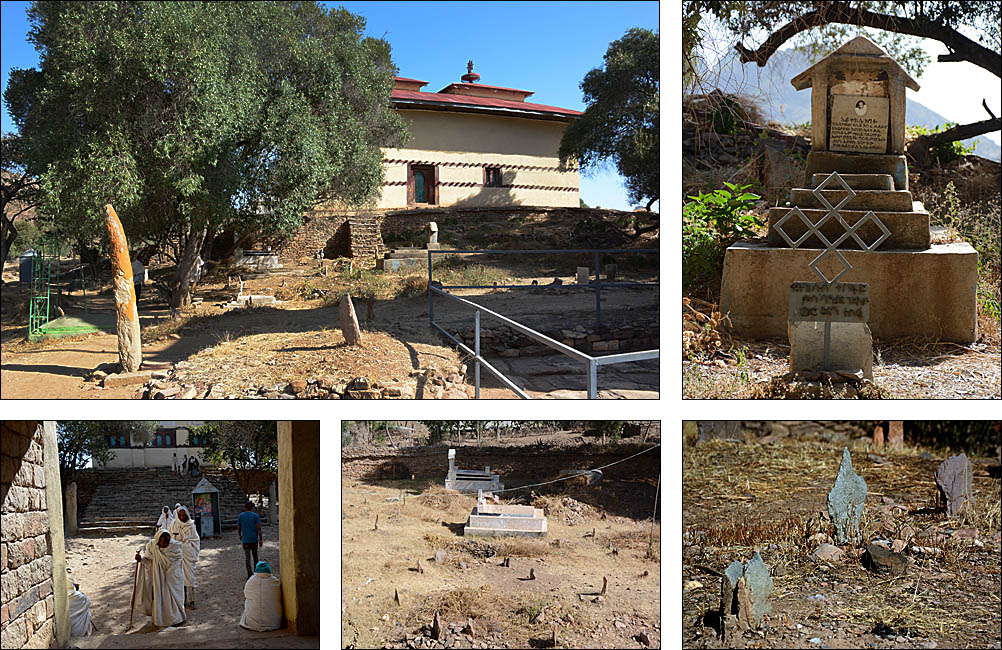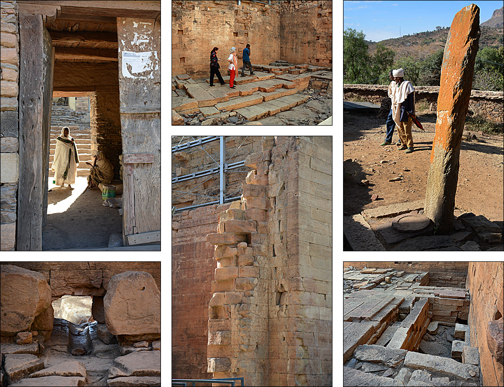 ![]() La route serpente le long de la frontière entre les hauts plateaux assez désertiques, couverts de terrasses dès que possible. ![]() ![]() ![]() Nous sommes accueillis par les statues d'anciens dignitaires au petit village de Yeha. Ci-dessous, la grande croix verte n'identifie pas une pharmacie comme on s'y attend, mais un salon de coiffure. ![]() Ce site à l'écart de la route est peu visité mais mérite vraiment le détour. Après avoir renforcé le bâtiment principal, des archéologues allemands sont en train de construire un petit musée pour réunir les nombreux objets trouvés aux alentours. Voici le Grand Temple, qui date du VIIème siècle avant J.-C. Les pierres jusqu'à 3 mètres de long sont assemblées sans mortier, parfaitement rectilignes : très impressionnant pour un bâtiment si ancien. ![]() C'est la civilisation la plus ancienne connue dans la région, près de 3000 ans, fondée semble-t-il à la fois par des Sabéens et des Ethiopiens. Dans l'enceinte, on voit des traces de piliers et d'étages disparus, mais aussi de bassins, de rigoles d'évacuation d'eau. Devant, on retrouve des stèles, que le petit cimetière attenant imite en miniature pour des tombes plus récentes. ![]() ![]() L'église attenante Abuna Aftse date des années 1940. Construite sur la base d'une église du VIème siècle, elle intègre des pierres du temple antique, notamment une petite frise représentant des ibex. Les petits trous sur la photo au-dessus des ibex est un awale très ancien creusé dans le sol, comme on en a vu plusieurs dans la région. De la hauteur de ce site, on a une vue magnifique sur une vallée presque verte. ![]() ![]() En contrebas de l'église, à l'étage du domicile des prêtres, un micro-musée renferme une collection de gravures, de bibles, de scultpures trouvées dans les champs par les paysans... Il y a de très belles pièces mais les conditions de conservation sont rustiques, surtout pour les bibles millénaires, et le musée moderne en cours de finition devrait accueillir tous ces trésors dans un cadre certes moins authentique mais plus adapté. ![]() Un peu plus loin, on a la grande chance de visiter Grat Be'ai Gebri avec la conservatrice allemande en charge de sa restauration et de la formation des équipes locales qui continuent le travail quand elle n'est pas là. Les parties les plus anciennes de ce vaste palais datent du VIIIème siècle avant J.-C. Couvrant 2500 m², avec d'énormes piliers monolithiques particulièrement hauts qui soutenaient plusieurs étages, c'est là aussi un bâtiment très impressionnant. On ne sait absolument rien de ceux qui l'ont construit ou qui l'habitaient, mais c'est d'autant plus étonnant en pensant qu'à cette époque, les Celtes commençaient seulement à arriver en Gaule, et Rome n'était pas sortie de terre. A part ça, "l'homme africain n'est pas entré dans l'histoire", n'est-ce pas ? ![]() ![]() |