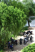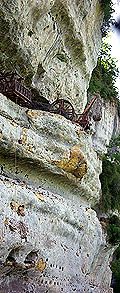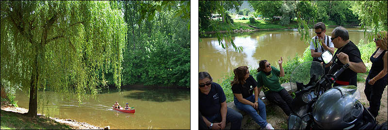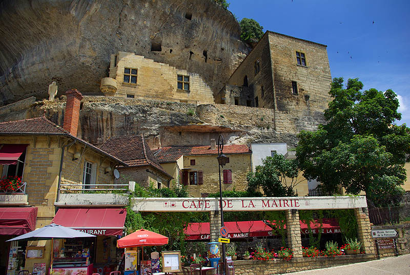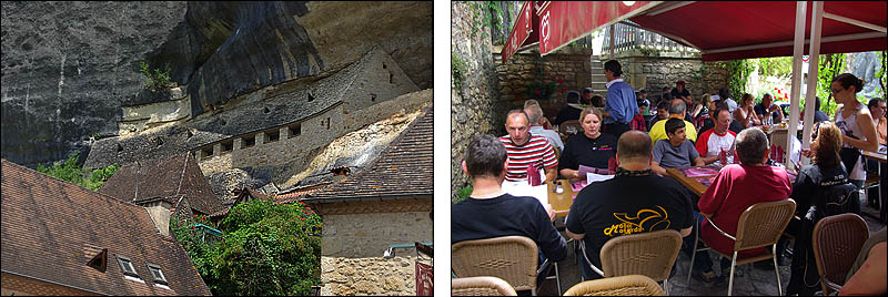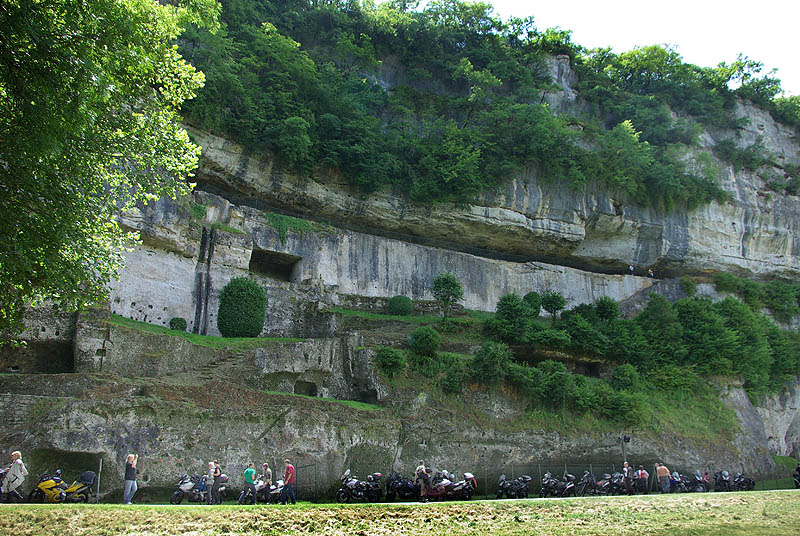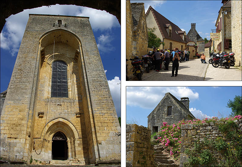 La balade commence à Beynac, à quelques kilomètres seulement du camping. Pas le temps d'y monter, c'est un peu un regret récurrent de la journée, mais en groupe et même avec un road-book très court (à peine une centaine de kilomètres), guère le temps de visiter. Ce sera donc juste des aperçus, et on y reviendra pour voir tout ça plus en détail. N'empêche, rien que depuis la route en contrebas, c'est un château perché particulièrement impressionnant !![]() ![]() A la demande insistante des Espagnols amateurs de bonne chère, on fait une pause chez l'un des nombreux producteurs de foie gras et autres joyeusetés culinaires de la région, très pas grasses et diététiques. En l'occurence, celui où on s'est arrêté était fermé, mais prévenu par un voisin, le propriétaire s'est empressé de venir ouvrir pour satisfaire la horde de stromeurs gourmets. ![]() Il va falloir mettre un peu de gaz cet après-midi si on veut tenir notre itinéraire, car à l'heure du déjeuner, on est seulement aux Eyzies de Tayac, un charmant village lové comme souvent par ici au pied d'une falaise. Il abrite un site préhistorique très intéressant... que nous visiterons la prochaine fois. Il est là depuis des dizaines de millénaires, il peut bien patienter quelques saisons de plus. Petit restaurant sympa, dont on apprécie les tarifs raisonnables. ![]() ![]() La Roque St Christophe : site préhistorique qui a fonctionné de 55.000 avant J-C. jusqu'à la Renaissance, avec une étonnante ville verticale et un système de poulies. C'est sans nul doute l'un des plus remarquable sites troglodytiques. ![]() St Léon sur Vézère, encore un très joli village bien préservé et fleuri. Il abrite notamment une église du XIIème siècle, ainsi qu'un château privé. Un comble pour cette région où l'on tombe sur un château à chaque virage et en haut de chaque colline : même en le voulant on n'a pas pu en visiter un seul car ceux qu'on a tentés étaient fermés ! Quelle idée de fermer les sites touristiques un week-end de fin juin... ![]() ![]() ![]() On a fichu une belle pagaille à St Armand de Coly. Tout endormi, lové au pied d'un spectaculaire clocher, et v'la que débarque notre gang de bikers espagnols, se garant partout, sonnant la cloche à grande volée (faut dire, laisser pendouiller la corde à l'extérieur était bien tentant) et braillant dans les rues. Bon désolé pour ces quelques minutes d'animation, mais c'était fort beau comme endroit. ![]() ![]() Sarlat, capitale du Périgord Noir, devint une cité dès le VIIIème siècle. C'est une ville exceptionnellement préservée, où l'on a l'impression de se promener au Moyen-Age. ![]() ![]() ![]() Le château des Milandes (ci-dessus), où Joséphine Baker avait accueilli la douzaine d'enfants qu'elle avait adoptés. A la suite de ses déboires financiers, le château avait été saisi, mais depuis il a été ouvert au public. Il nous a fermé ses portes sous le nez, décidément... Un petit mot en l'honneur de Joséphine Baker, une des pionnières de la lutte contre la discrimination raciale, grande résistante pendant la Seconde Guerre mondiale, et qui eut le courage d'adopter des enfants de toutes les couleurs à une époque où ce n'était pas à la mode. ![]() Pour conclure cette balade magnifique, on a grimpé à Domme, dont le promontoire offre une vue sublime sur la vallée que l'on venait de parcourir. ![]() ![]() |
