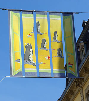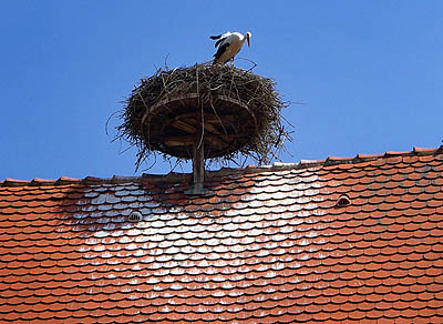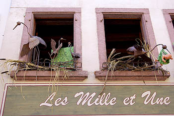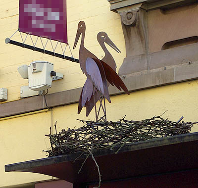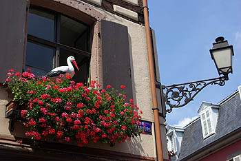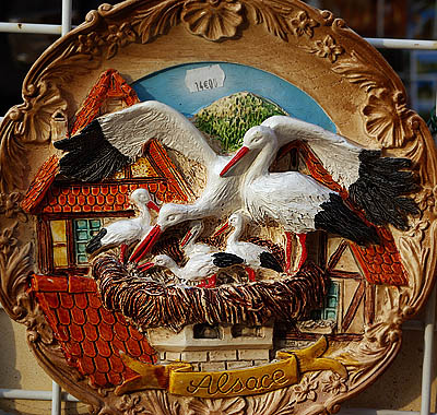 Cet échassier, devenu symbole de l'Alsace, avait déserté la région et il n'en restait qu'une vingtaine d'individus en 1975. Grâce aux ornithologues, plusieurs dizaines de couples sédentarisés y nichent de nouveau. Après trois ans de captivité, elles perdent l'instinct de migrer et vivent à demeure en Alsace, suffisamment bien nourries pour ne pas craindre le froid. En tous cas, elles sont largement représentées sur les façades et les boutiques à touristes, sous toutes les formes et à toutes les sauces (euh non, pas les sauces, ça ne se mange pas c'te bête-là !).