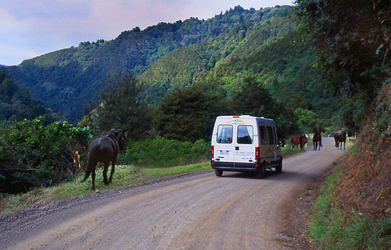 Parc d'Urewera (Nouvelle-Zélande) Sur l'atlas, une belle nationale. Dans les faits, une piste en "tôle ondulée" gravillonnée qui faisait déraper le camping-car à chaque virage pourtant abordé à basse vitesse, et danser la java aux ustensiles de cuisine dans les tiroirs qui montraient des velléités d'indépendance. A mi-chemin, on a rejoint un observa-