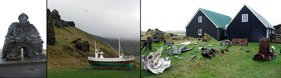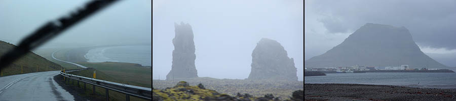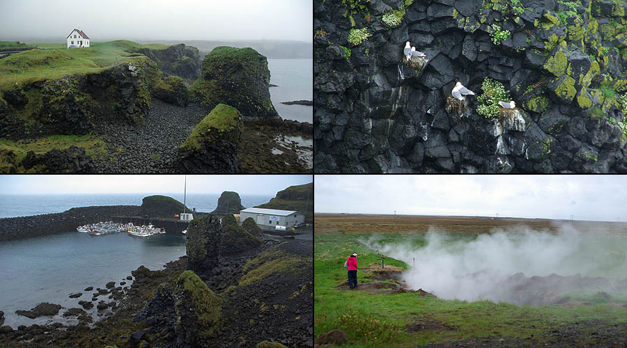 ![]() En quittant la péninsule des fjords du nord-ouest, pour éviter de refaire la même unique route en sens inverse, nous traversons par le ferry pour rejoindre la péninsule de Snaefellsnes. Un trajet de 2H, bien calme, avec escale à l'île de Flatey, un hameau de pêcheur posé directement sur l'eau (ci-dessous). ![]() ![]() On arrive en fin de journée (oui, on sait, au ciel ça ne se voit pas, mais il est bientôt minuit là) à Stykkishòlmur, un village plutôt agréable avec des maisons colorées et une étrange église moderne. ![]() ![]() La péninsule est un endroit magnifique. Du moins, c'est ce qu'en dit le guide du Routard. En pratique, on n'en voit hélas pas grand chose, tout est noyé dans un épais brouillard poisseux et gelé. On roule toute la journée sous la pluie sans rien voir, même pas le volcan-glacier Snaefellsjökull parfaitement rond autour duquel on tourne, mais c'est un aperçu assez réaliste de la région ! ![]() ![]() Par endroit, c'est post-apocalyptique. Les hameaux pourtant habités semblent déserts et aussi abandonnés que les carcasses de maisons qui jalonnent parfois la plaine, avec pour toute compagnie quelques pierres tombales, c'est d'un gai... ![]() Même les petites attractions comme le musée de la marine sont encore fermées, attendant consciencieusement le 1er juin (deux jours après donc) pour daigner s'animer. La saison touristique se déroule essentiellement l'été, ou carrément en hiver pour voir les aurores boréales. ![]() ![]() Les champs de lave sont particulièrement étranges et inhospitaliers avec leurs formes torturées. On distingue nettement les vagues de magma ou les bulles géantes figées en train d'éclater. Ailleurs, le refroidissement a été plus lent et a créé d'énormes cristaux de basalte jusque dans la mer comme ici à Arnarstapi, considéré comme un lieu sacré où se réunissent encore sorciers et chamans. Et ce n'est pas fini, des fissures fumantes courent souvent le long de la route. Ce n'est que de la vapeur, mais la lave n'est pas loin. ![]() Des pistes en forme de boucles rayonnent depuis la route principale pour desservir les hameaux, et les carrefours accueillent des station-service rustiques. En bas de la péninsule, un tunnel payant fait passer sous le fjord et quand on émerge... c'est presque Reykjavik. ![]() | |
