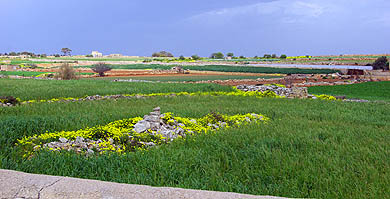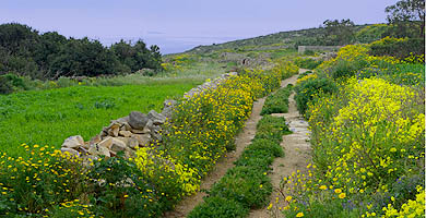 La flore est typique de ce qu'on trouve naturellement sur Malte : fleurs rases (les jaunes s'appellent Sabot-de-chèvres), chardons...
