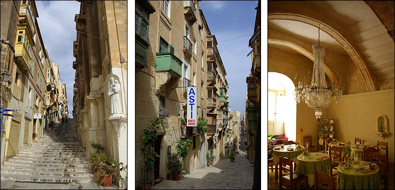 ![]() S'il y a bien entendu toutes les boutiques modernes de fringues et de télécom, on trouve encore au détour des ruelles des échoppes à l'ancienne, minuscules, tassées entre deux restos de chaîne, ou au contraire étalant leur marchandise dans une joyeuse pagaille, comme portées par le vent de l'Afrique si proche. Pour manger le choix est vaste (mais pas exceptionnel), avec notamment pas mal de vendeurs ambulants. Et sans surprise, l'iconographie à la fois romancée et dévoyée des chevaliers occupe la majorité des souvenirs à touristes, du plus mauvais goût au... encore pire ! Heureusement, le bel artisanat compense un peu. ![]() ![]() Signe architectural emblématique, les balcons fermés ou bow-windows ornent la majorité des façades. En plus ou moins bon état, unis ou dépareillés, alignés ou étonnamment disposés, ils permettaient notamment aux dames élégantes de prendre l'air et de voir la rue sans pour autant s'exposer au soleil, préservant ainsi leur pâleur de bon aloi. ![]() ![]() ![]() Ci-dessous, la petite pension Asti, où nous avons logé. Si nous pensions changer régulièrement d'hôtel comme on fait généralement, en fait Malte est si petite et l'offre d'hébergement si réduite que finalement, si on est bien quelque part, autant y rester et rayonner à partir de là dans le reste du micropays. Et là, nous étions plutôt pas mal. A titre indicatif, c'était 40 Euros pour deux la nuit, petit déjeuner inclus, et super bien placé a quelques minutes des remparts et de la gare des bus, tout en étant au calme dans le centre-ville. ![]() |