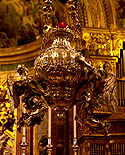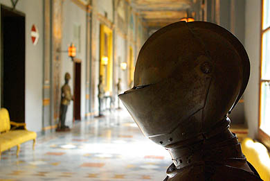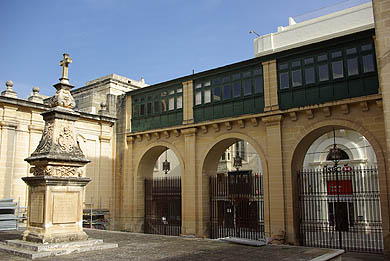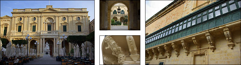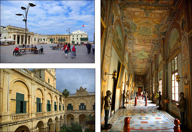 ![]() La Valette est couverte de palais, dont celui des Grands Maîtres, ci-dessous, est sans doute le plus bel exemple. C'est d'ailleurs là que le président reçoit ses hôtes de marques. Bâti dans les années 1570, agrandi et encore embelli par la suite, on y admire particulièrement son grand couloir au sol en marqueterie de marbre, au murs et plafond couverts de peintures, gardé par d'imposantes armures, ainsi que ses salles d'apparat aux riches tapisseries et tentures. ![]()