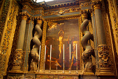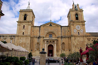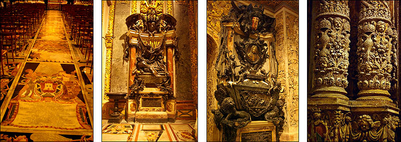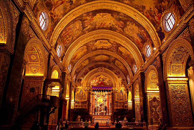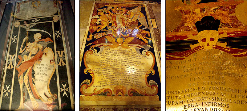 Pièce maîtresse de la ville à ne surtout pas rater, la co-cathédrale St Jean (la "vraie" cathédrale étant à Mdina) est très impressionnante. Avec un audioguide bien fichu, on découvre sa nef peinte par les plus grands maîtres, ses moulures incroyablement sculptées, ses énormes candélabres d'argent massif... Son sol dallé est intégralement constitué des stèles tombales des Chevaliers, toutes différentes, en marqueterie de marbre parfois incrusté d'or ou d'argent, dont les textes et symboles portent la marque d'un humour grinçant et de rappels de la mortalité de chacun, rendant vaine toute vanité ("toi qui me marche dessus, un jour on te marchera dessus"). Tout autour de l'abside, huit chapelles représentent les huit "langues" des Chevaliers (Provence, France, Italie, Allemagne, Auvergne, Aragon, Castille et Portugal), qui forment aussi... les huit pointes de la croix de la Malte, qui vient de là. Chacune est très richement ornée dans un style spécifique, avec ce qui se faisait de mieux dans chaque culture, et accueille des monuments assez peu modestes (!) à la gloire des grands maîtres de chaque langue. ![]() ![]()