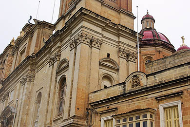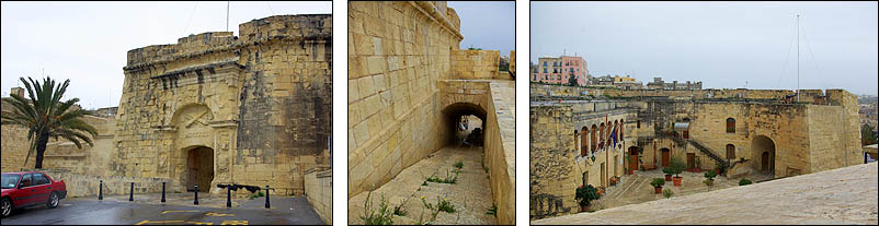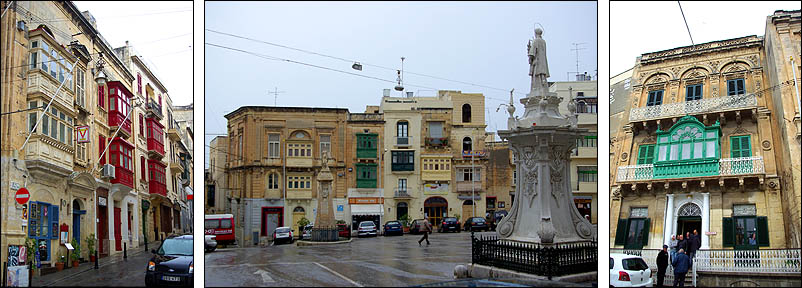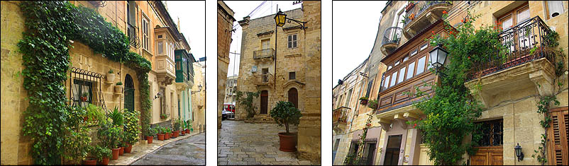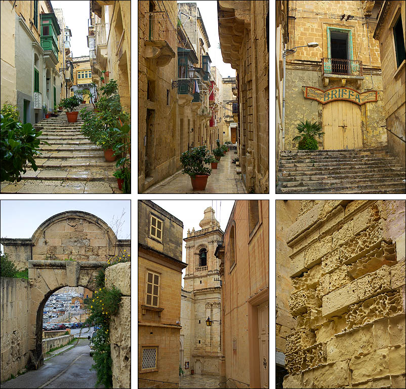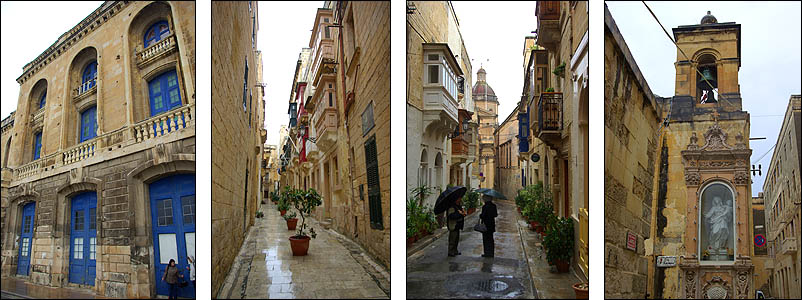 Ci-dessus à droite, l'omniprésente pierre chaude de Malte vieillit mal, et maisons comme murailles