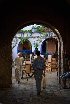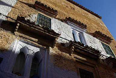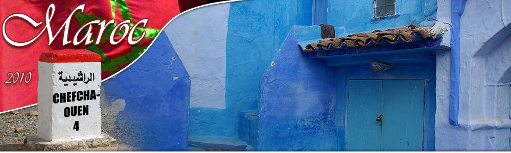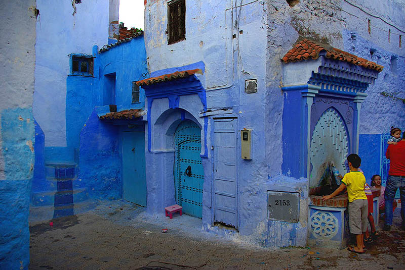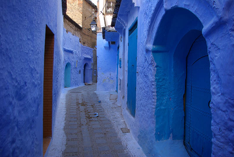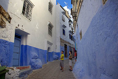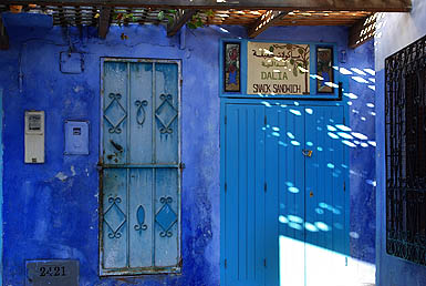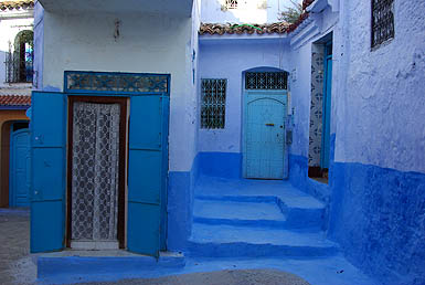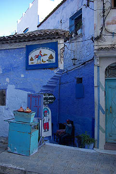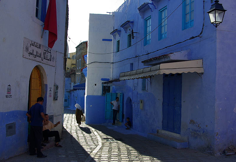 ![]() Signe distinctif : c'est bleu ! Blanche de loin, la ville devient bleue quand on parcourt ses rues, car les maisons et parfois les sols sont badigeonnés dans toute la gamme du cyan à l'azur en passant par l'indigo et le marine. Comme à Jodhpur en Inde, il paraît que c'est pour lutter contre les insectes. L'impression est assez féérique, d'autant que lors de notre passage la vieille ville était presque déserte et silencieuse - enfin, seulement jusqu'au coucher du soleil qui marque la fin quotidienne du jeûne du ramadan... au moment où on essayait de dormir !