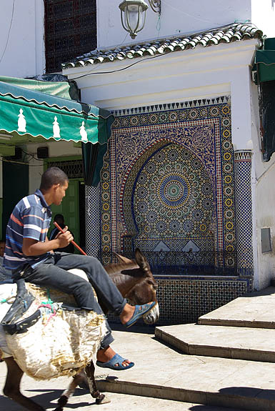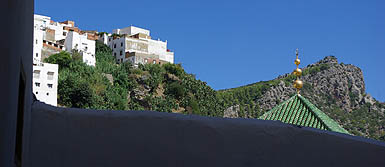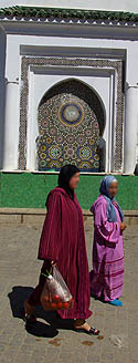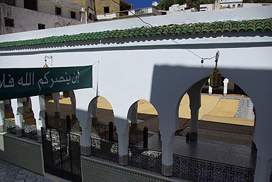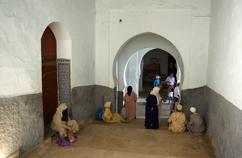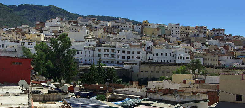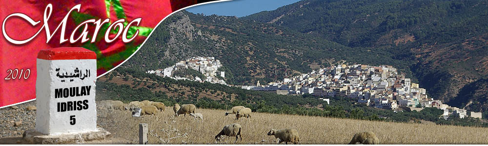 ![]() Moulay-Idriss est un village saint où est enterré l'arrière-petit-fils éponyme de Mahomet. Pour les musulmans modestes, ce pélerinage équivaut à celui de la Mecque. Pour un visiteur non-musulman, l'intérêt de la ville est limité, car on n'a pas le droit d'accéder au tombeau. Reste une petite médina pas indispensable, mais plutôt authentique. Détail amusant, de loin, le village a une silhouette de dromadaire couché, avec le tombeau en guise d'oeil, voir le bandeau tout en haut de cette page.