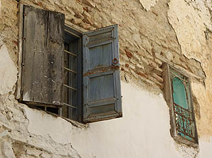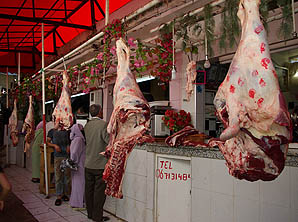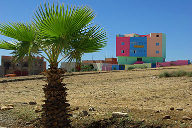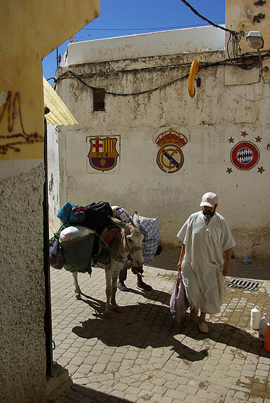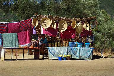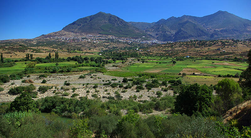 Moulay Idriss ![]() Très belle nationale qui longe les oliveraires et les sapinières de l'Atlas, puis de grandes plaines à blé (leur irrigation consomme d'ailleurs un énorme volume d'eau). On traverse des villages poussiéreux et un peu endormis, avec toujours beaucoup d'hommes désoeuvrés pendant que les femmes sont au lavoir ou aux champs. Les meules de foin sont des vraies meules à l'ancienne, en forme de maison ou bien entièrement recouvertes de terre séchée. Les vaches, moutons et chèvres ont bien peu à brouter, tout est sec, mais c'est la fin de l'été. Parfois, un village semble pris d'une frénésie de rénovations, liées semble-t-il au vaste programme de "grands travaux" lancé par le roi. Routes, ponts, peintures des façades, canalisations... un vent de modernisation souffle dans les campagnes.