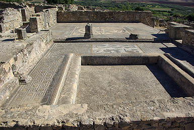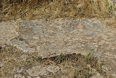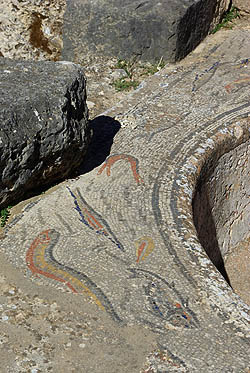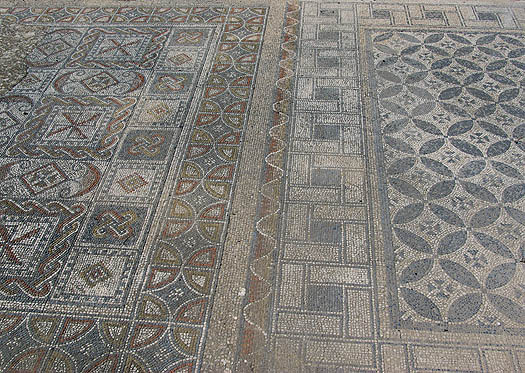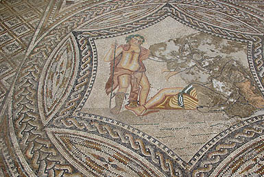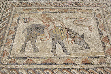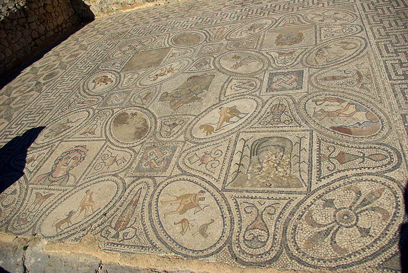 Une des caractéristique de Volubilis est ses magnifiques mosaïques, comme ci-dessous celle représentant les douze travaux d'Hercule. On les apprécie particulièrement en situation dans les restes des maisons patriciennes, mais en même temps c'est assez regretable qu'elles soient ainsi exposées quotidiennement au soleil, aux intempéries, et aux pieds des visiteurs indélicats. Certaines sont envahies d'herbes folles et délogées par les racines, quel dommage ! ![]()