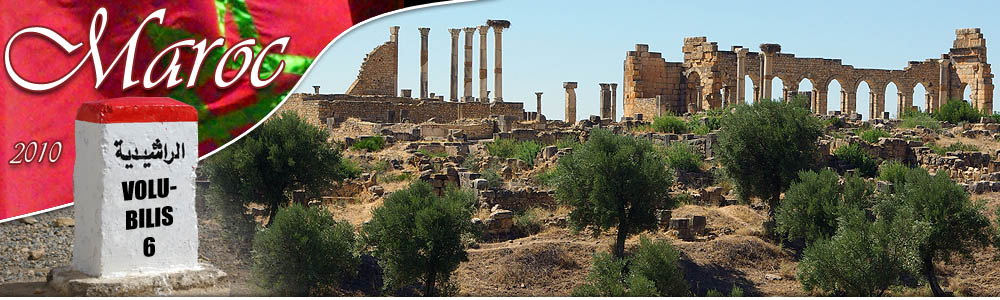 Volubilis ![]() La ville romaine de Volubilis fut fondée par Juba II, roi de Maurétanie, et aurait compté jusqu'à 20.000 habitants. Les bâtiments datent du IIème et IIIème siècle après J.-C. Aujourd'hui, seuls 15 hectares sur les 40 du site ont été déblayés. Ce site est classé au patrimoine mondial de l'Unesco, mais les crédits tardent à venir pour continuer les fouilles. Plus de détails sur Wikipedia par exemple. ![]() Ci-dessus, devant la vaste plaine agricole de la région de Meknès, l'arc de triomphe de Caracalla ouvre sur le decumanus maximus, la voie qui continuait jusqu'à Tanger. Ci-dessous, la basilique des Berbères chrétiens. Initialement, ce bâtiment purement romain était un tribunal et la salle municipale. C'est de cette forme rectangulaire avec abside que les chrétiens s'inspirent pour élever leurs édifices religieux. Au fond sur la montagne la forme blanche de Moulay-Idriss. ![]()