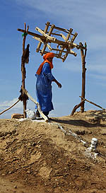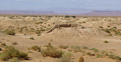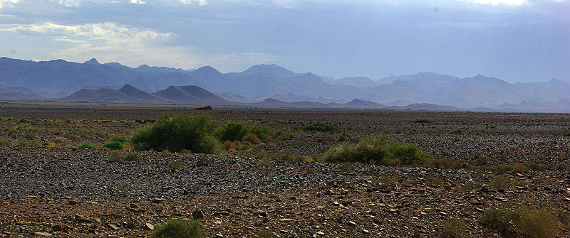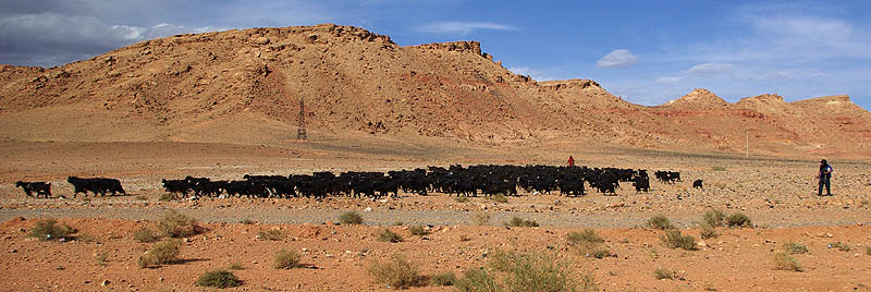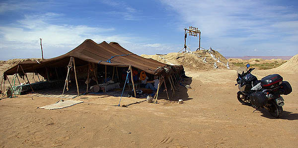 Etape à ce "resto routier berbère" pour s'hydrater un peu d'un thé à la menthe, en discutant avec un hôte très polyglotte. Il nous explique notamment l'étonnant système d'irrigation souterrain, qui a parsemé le paysage de puits en forme de termitières (ci-dessus à gauche), aujourd'hui abandonnés. Un des derniers exemples est visible derrière la tente.