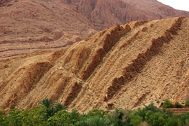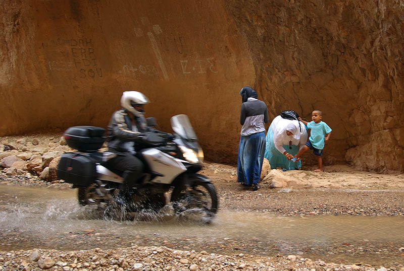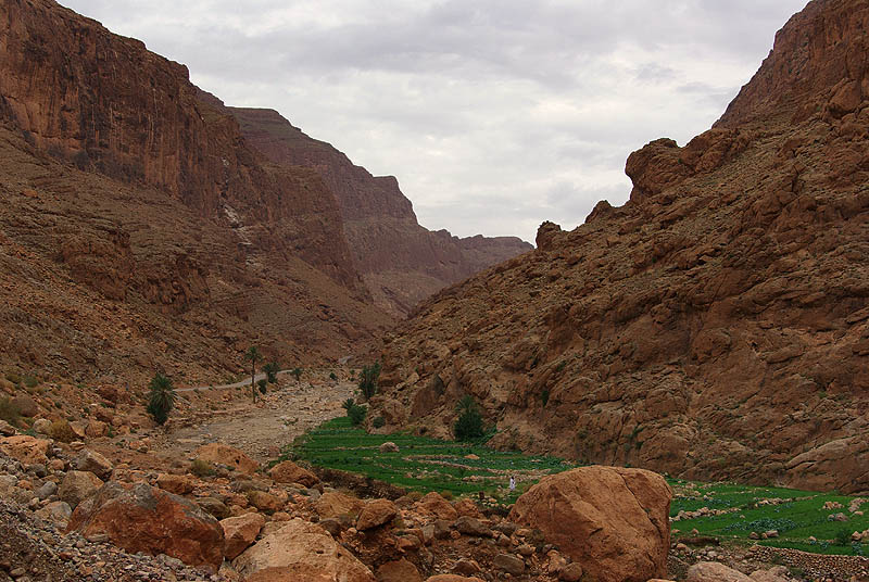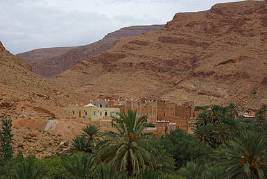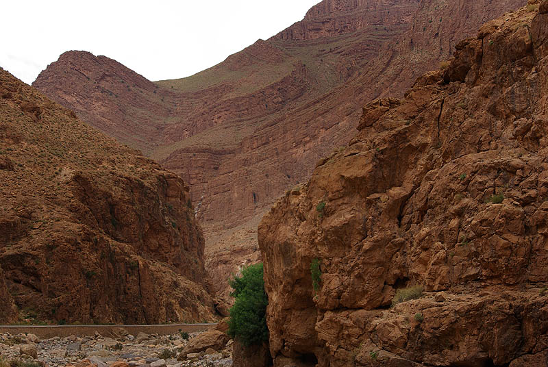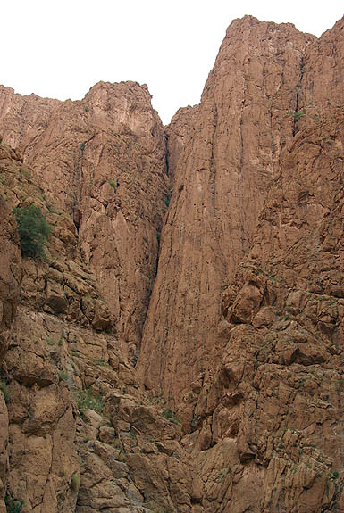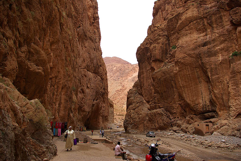 ![]() Tinherir (ou Tinghir) est réputé pour sa palmeraie qui s'étend jusqu'à l'Atlas, irriguée par l'oued Todgha. Le temps se couvrait et virait à la pluie, on y a donc passé la nuit (à l'auberge d'Aïssa, adresse très sympa) avant d'attaquer les gorges du Todgha, un peu au nord. ![]() Ces gorges étonnantes font un peu penser au Siq de Pétra, en Jordanie, avec des aplombs de 300 mètres en roche rouge, découpés dans l'épaisse couverture calcaire du Haut Atlas. On y a tourné notamment des scènes de "Laurence d'Arabie" et "Cent mille dollars au soleil". Emportée par une crue au printemps 2007, la route est toujours en travaux et devient piste, voir simple gué dans le ruisseau.