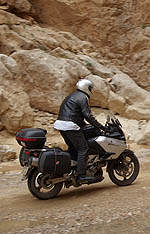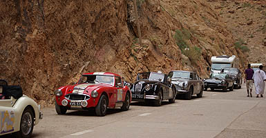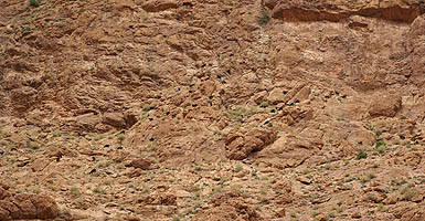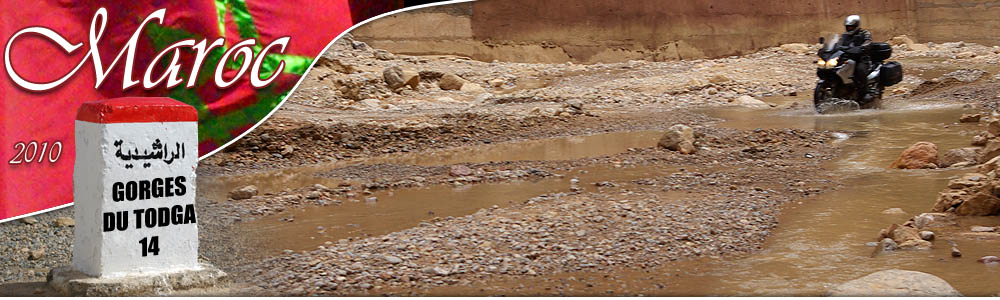 ![]() Une fois passé le défilé, la route continue vers la montagne et Tamtattouchte. On avait prévu de faire une boucle par le nord et redescendre via le Dadès, mais l'état des pistes et la météo instable nous incitent à redescendre sagement vers une nationale bitumée. On croise tout un raid d'anciennes voitures anglais de rallye, dont on se demande s'ils se risquent dans les gués et sur la caillasse. Quelques Espagnols en TW125 aussi, et des touristes locaux à dix dans des vieilles voitures, bon courage pour les courbes de côte ! Ci-dessous à gauche, les petits points noirs sont des chèvres. On a beau savoir que ça grimpe partout ces bestiaux, c'est quand même impressionnant de les voir ainsi à flanc de falaise.