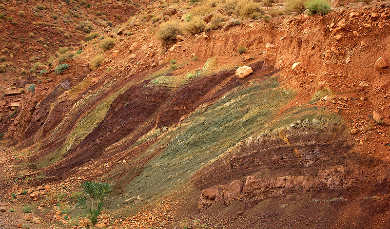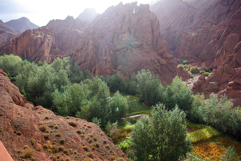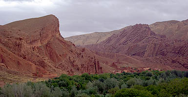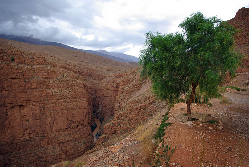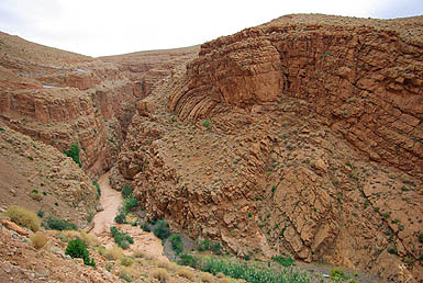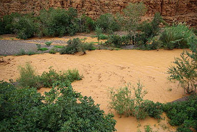 Le travail de l'érosion et les couches géologiques très variées forment des paysages assez fantastiques, même sous la lumière plate d'un ciel plombé. L'oued gonflé par les orages prend une extraordinaire couleur de "lait à la canelle", alors que c'est pratiquement une coulée de boue, chargée d'alluvions et de sable. ![]()