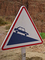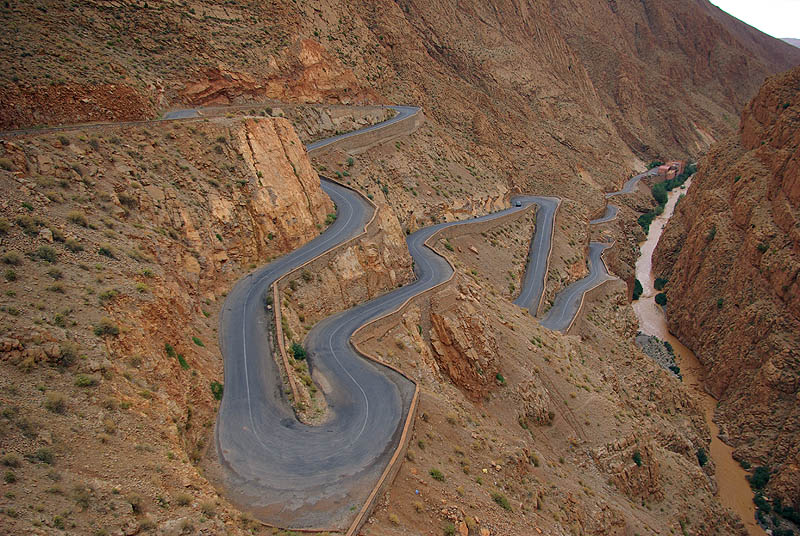 Cette formation est surnommée "vallée des corps humains" car la légende veut que les invités d'une noce ayant gâché de la nourriture sur le passage des mariés aient été pétrifiés par le dieu offensé. On retrouve une légende très similaire à l'étonnant Bryce Canyon, dans l'Ouest américain. ![]() ![]() Attention, ça tourne ! Récemment bitumée, cette route reste assez glissante sous la pluie, avec sable et gravier coulant des falaises, mais on n'est pas pressés. D'en haut, la vue sur l'étroit défilé est impressionnante. Mais comme au Todgha, après quelques kilomètres le paysage redevient moins spectaculaire, la météo de moins en moins engageante, et on rebrousse chemin comme prévu. ![]()