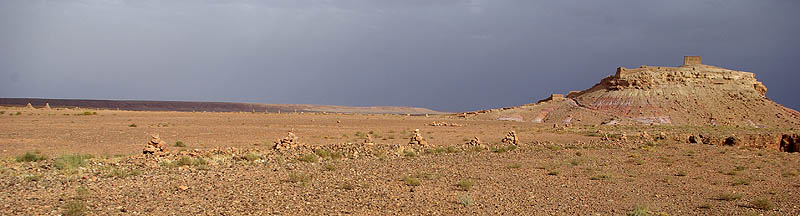 ![]() En attendant la décrue, on a tout le temps de visiter plus en détail le ksar, allant jusqu'au fort installé au sommet de la colline, mais l'eau ne donne aucun signe de bien vouloir décroître, au contraire ! Refusant de céder au chantage de quelques gars du coin qui veulent nous extorquer des sommes ridicules pour nous guider jusqu'à un passage, on attend avec le jeune gardien. ![]()