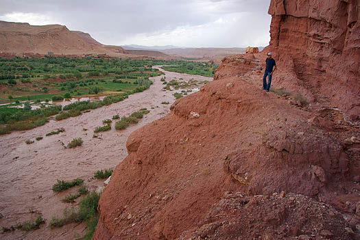 ![]() Un dédale de ruelles et d'impasses mène au sommet de la butte, où restent les traces d'un fort. C'est de là-haut qu'on découvre une petite surprise : l'oued déjà assez haut à l'aller est à présent déchaîné ! Sur la photo ci-dessus, l'eau à beau être de la couleur des roches, elle n'en inonde pas moins le passage d'une rive à l'autre, recouvrant les digues et les champs... et bloquant toute issue pour le moment.