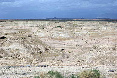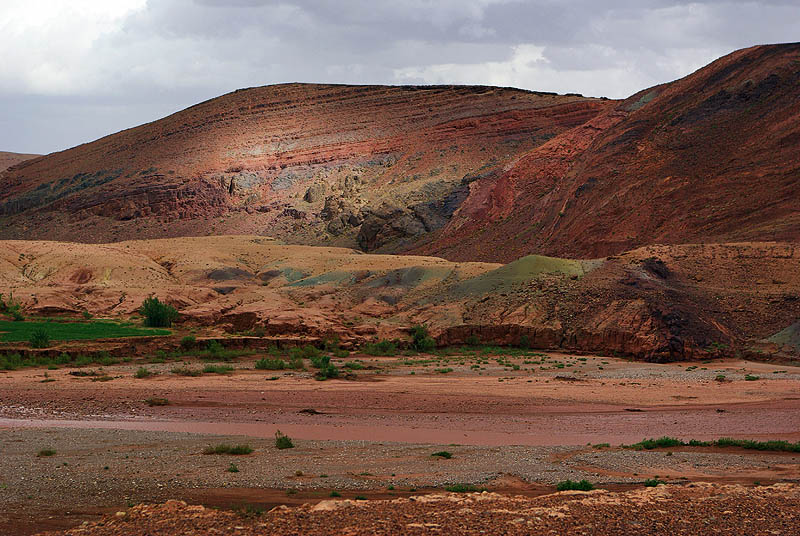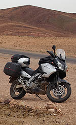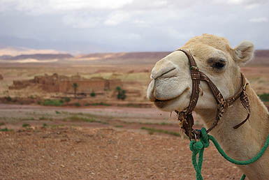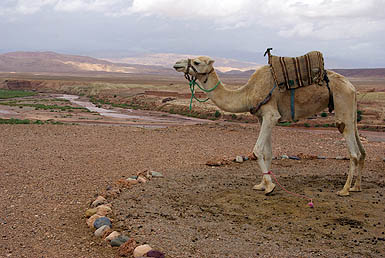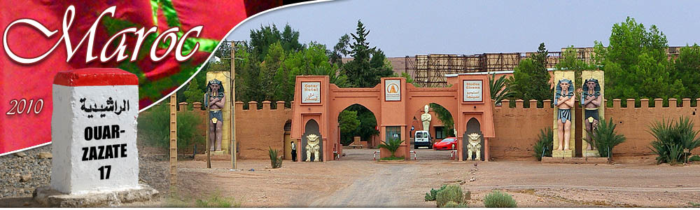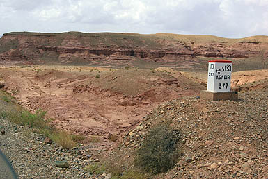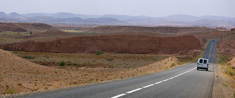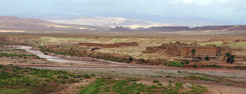 Ouarzazate est la "Porte du désert". La route qui mène à la vallée du Drâa traverse des étendues de caillasse, et encore des étendues de caillasse, avec les montagnes en toile de fond, des villages de pisé, des ksar abandonnés. C'est un peu monotone, même si les perspectives sont belles. Un vent sec et dessechant s'est levé, le choix est difficile entre garder la visière ouverte pour avoir de l'air, et la fermer pour éviter le vent de sable... ![]()