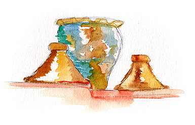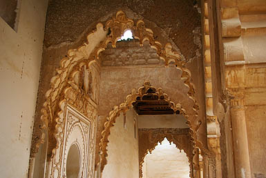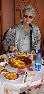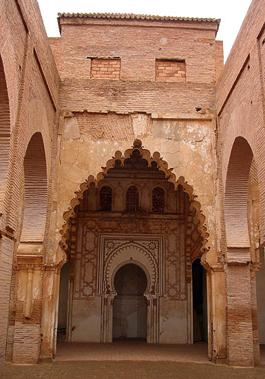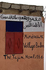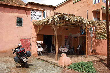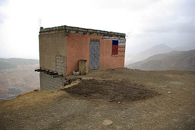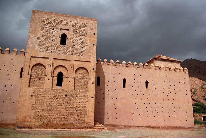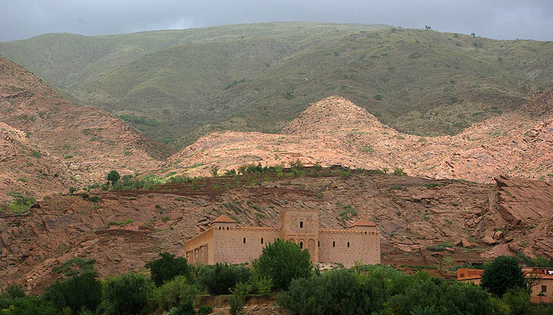 Un exemple des petits magasins (très) au bord de la route, à la fois resto et boutique de souvenirs, vendant des pierres et des "momlitte" (omelettes ?). Moins en équilibre, des villages se confondent avec la montagne. Beaucoup d'arganiers, de cyprès, de noyers et d'amandiers, dont le vert intense tranche sur le rouge soutenu des roches, même sous un ciel bas et gris. ![]() ![]() Tin-Mel (datant du XIIème siècle) est, avec celle gigantesque de Casablanca, la seule mosquée du Maroc où les non-musulmans sont admis. Certes, à Casa c'est payant, et Tin-Mel est en ruine après des siècles d'abandon... Mais désormais site classé, elle est en cours de restauration. Ses alignements de voûtes en arcs lobés, ses chapitaux richement décorés contrastant avec la sobriété initiale des Almohades, son isolement à ciel ouvert, font de cette étape une très agréable et intéressante visite.