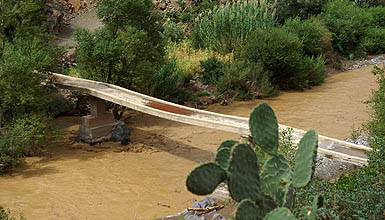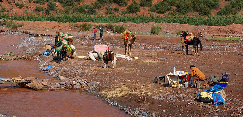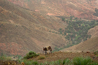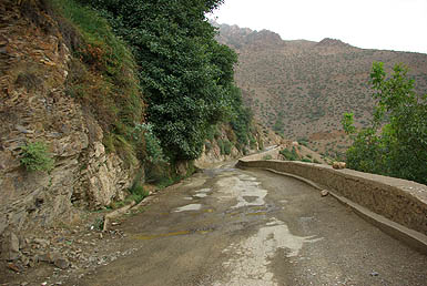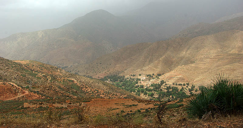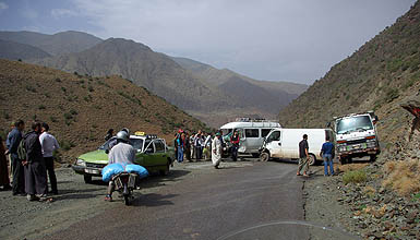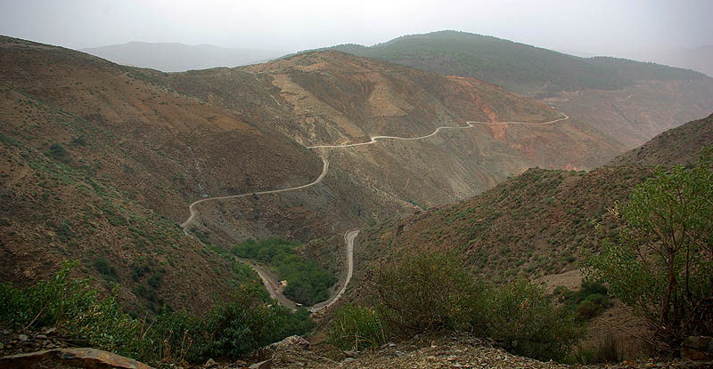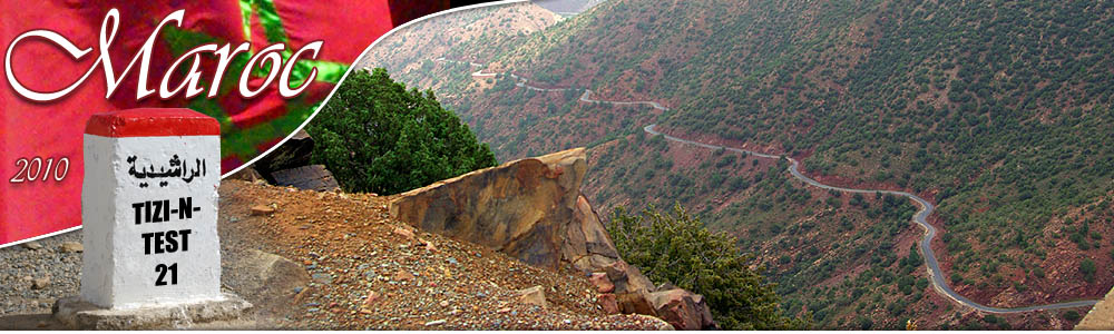 Tizi-N-Test ![]() 222 kilomètres entre Taroudannt et Marrakech, ça n'a l'air de rien (une heure par l'autoroute :-P), mais par la route du Tizi-N-Test, c'est une autre histoire. Surtout quand la pluie menace et que la chaussée est régulièrement coupée par des coulées de boue et de gravier qui la rendent extrêmement glissante. La conduite est difficile et épuisante même pour la passagère, et on a bien cru se retrouver par terre plus d'une fois. Et là, ça n'aurait pas été dans du gentil sable mou ! Mais finalement, on s'en est tirés.