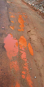 Ci-dessus, la chaussée est théoriquement bitumée, c'est que disent les cartes. En pratique, c'est assez irrégulier. Et la glaise rouge qui la recouvre par endroit (ci-contre) n'arrange rien... Pour avoir conduit la moto sur du verglas, c'est très comparable. ![]()