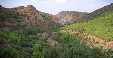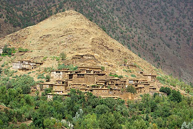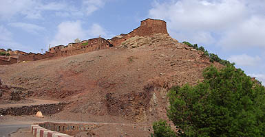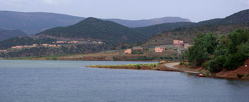 ![]() Ci-dessus, lac artificiel né du barrage Lalla Takerkoust. Il a noyé des maisons dont on distingue le haut des toits, tandis que des routes plongent droit dedans, c'est étrange. Ci-dessous sur une hauteur, un village fortifié. A partir de là, la zone devient plus touristique, une villégiature pour les marrakchis fuyant les grandes chaleurs de la ville, et du coup la route est bien meilleure. Ensuite, c'est même une grande belle nationale toute droite, et franchement ce n'est pas de refus après six heures à se faire des frayeurs sur la patinoire de montagne !
