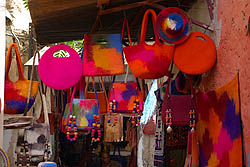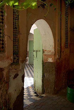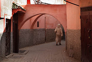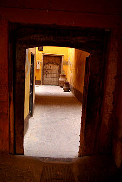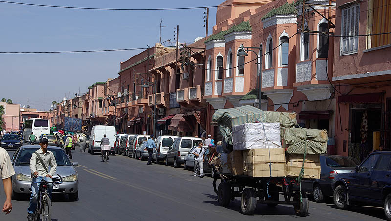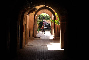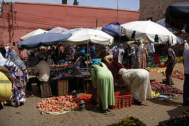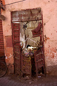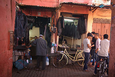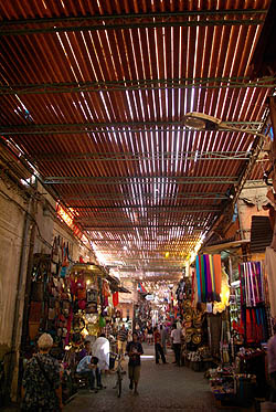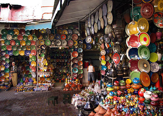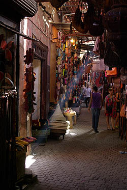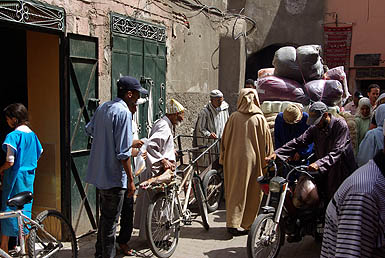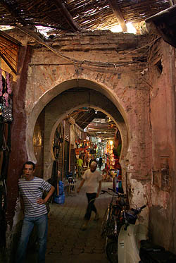 Derrière la place s'étend la médina, qui couvre tout de même 600 hectares. Disons-le tout de suite, il faut vraiment s'enfoncer loin pour fuir les cars de touristes qui se font escroquer de façon impressionnante. Ne dit-on pas "Marrakech-Arnakech" ? En se conditionnant à ne RIEN acheter malgré les tentations permanentes, et en se perdant sans but précis, on peut apprécier des rues intéressantes, des échoppes pleines de couleurs et de vrais artisans.