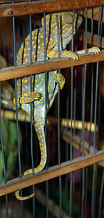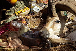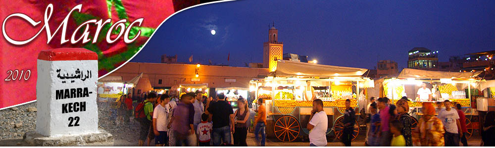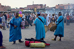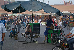 ![]() La célèbre place Jemaa el Fna ("Assemblée des Trépassés", ou "place du néant", en mémoire des exécutions qui y avaient lieu) est une vaste étendue pavée dont l'intérêt réside dans son animation nocturne : à partir de 19H, tout un écosystème touristique se met en place, à base de restaurants ambulants, de vendeurs de jus de fruits, de musiciens et amuseurs divers, tatoueuses de hénné, montreurs de serpents, d'ours ou de singes (ci-dessous à droite), vendeurs de grigris... et touristes en pagaille !