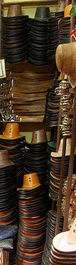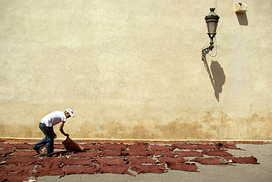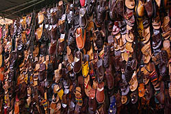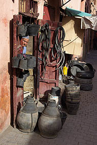 De nombreux artisans travaillent souvent dans de minuscules échoppes : tailleurs, recyclage créatif des pneus (ci-dessus au centre) donnant naissance à toutes sortes d'objets usuels, ferronniers, potiers, et beaucoup de travailleurs du cuir avec toutes les étapes depuis le tannage des peaux (ci-dessous à gauche) jusqu'à la fabrication de milliers d'accessoires de mode...