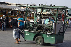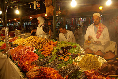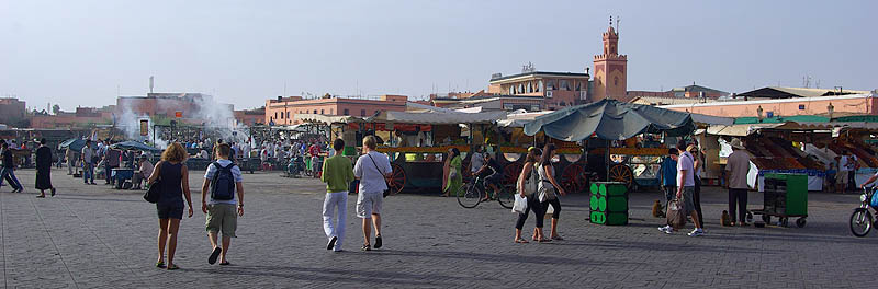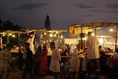 Si ce lieu a longtemps été réputé pour son authenticité, aujourd'hui tout est bien propre, numéroté, électrifié, sécurisé... On est gentiment alpagué par les rabatteurs des restaurants qui proposent des petites portions à prix assez correct de brochettes, soupes, desserts, fruits de mer, et bien évidemment de couscous et de tajines. On entend toutes les langues d'Europe et d'ailleurs, mais il reste une clientèle marocaine qui permet d'éviter de justesse le côte entièrement "parc d'attraction". La place a été classée "Patimoine oral de l'humanité" pour ses conteurs et musiciens. On avoue les avoir surtout trouvé agressifs quand on a le malheur de les écouter ne serait-ce que trois secondes sans lâcher systématiquement quelques pièces...