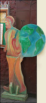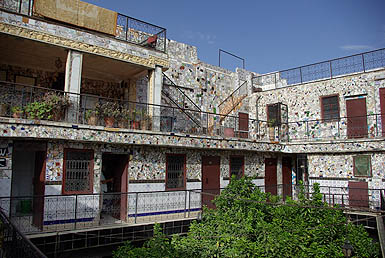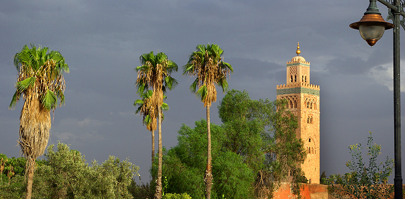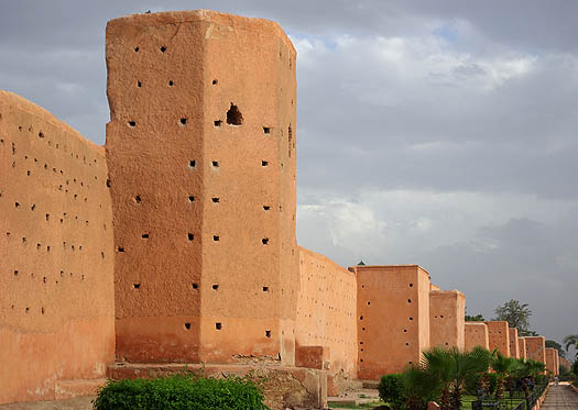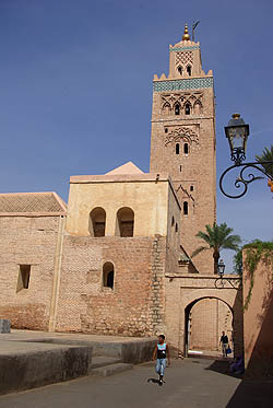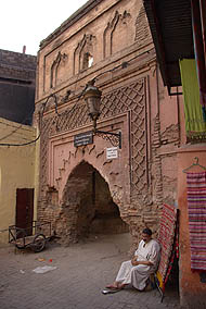 Marrakech a conservé dix kilomètres de son enceinte du XIIème siècle. Hautes de 6 à 9 mètres pour une épaisseur de 1,5 à 2 mètres, ces murailles en pisé d'argile et de chaux, parsemées des traditionnelles encoches d'échafaudages et de deux cents tours, sont impressionnantes. Le minaret de la Koutoubia, la "mosquée des libraires", date également du XIIème siècle. Monument emblématique, haut de 77 mètres en comptant la flèche, il est surmonté de quatre boules dorées dont diverses légendes racontent l'origine. ![]() On a trouvé le petit hôtel Afriquia, bien situé et plutôt calme. Son patio décoré de mosaïques aux faux airs de Gaudi était plutôt agréable, mais attention, les prix à Marrakech sont proportionnellement plus élevés qu'ailleurs. Dommage qu'on l'ait su trop tard, mais on aurait pu garer la moto dans la cour pour moins cher que le parking public.