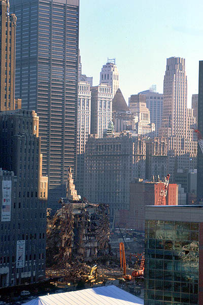 Ci-contre, fin octobre, les autres bâtiments du complexe du World Trade Center (abritant notamment des administrations). Tous ces immeubles ont disparu à présent. |